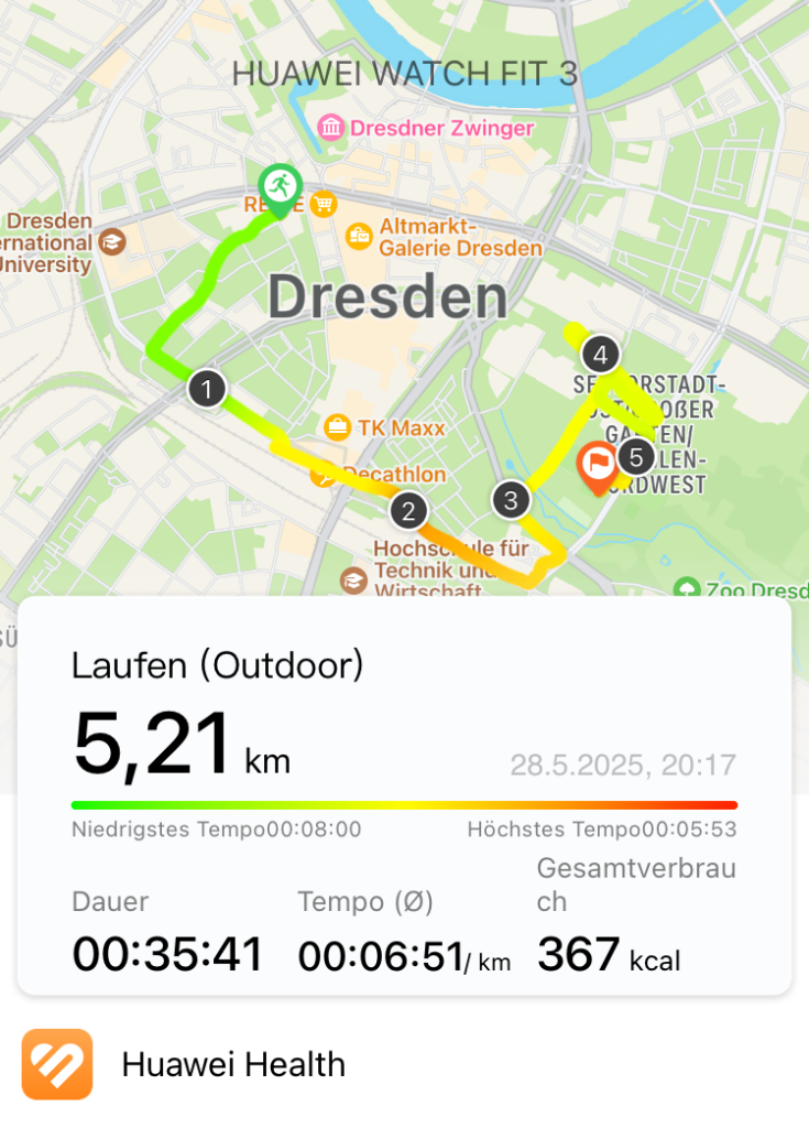 Die Strecke war ein klein wenig anders als bei den vergangenen 3 Läufen, die ich mitgemacht hatte. Wir joggten durch den Tunnel am Wiener Platz. Dort war ein DJ und hat ordentlich Party gemacht, das nannte der Veranstalter dann „Powerzone“. Wie üblich war die zweite Powerzone dann der Wochenmarkt zwischen Stadion und Hygiene-Museum, was sich ganz schön zog…