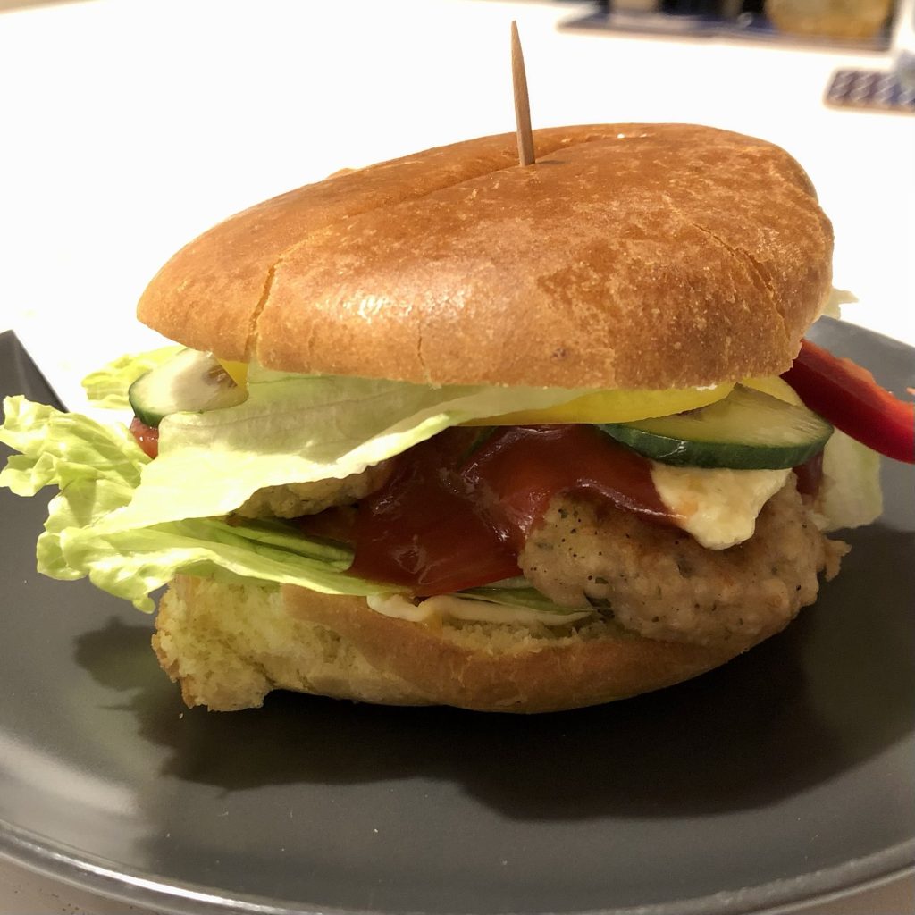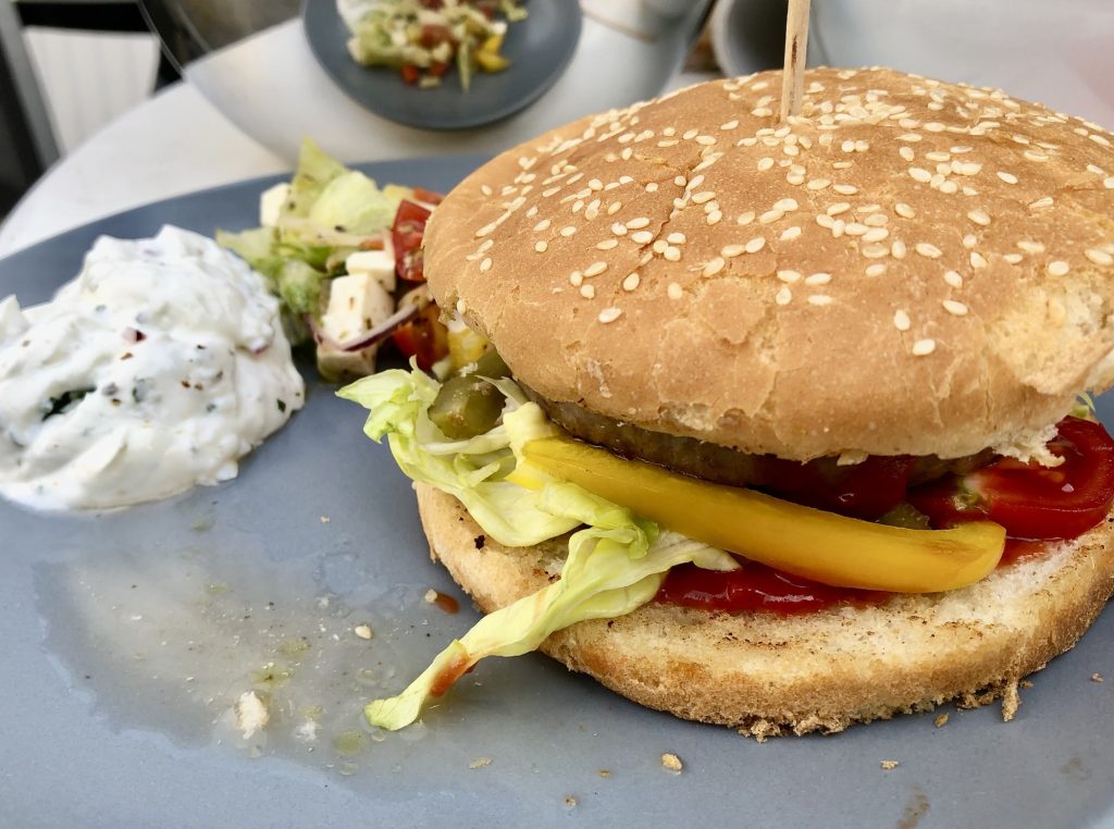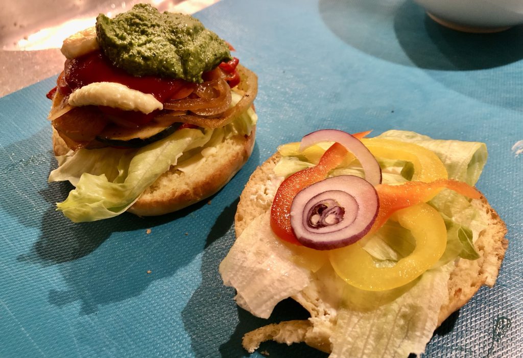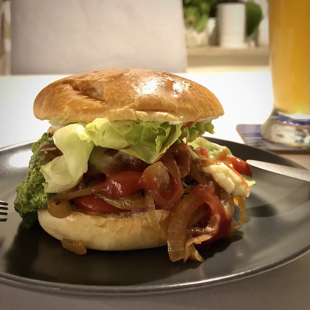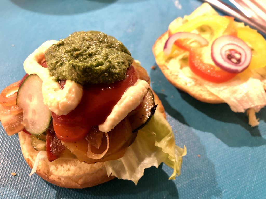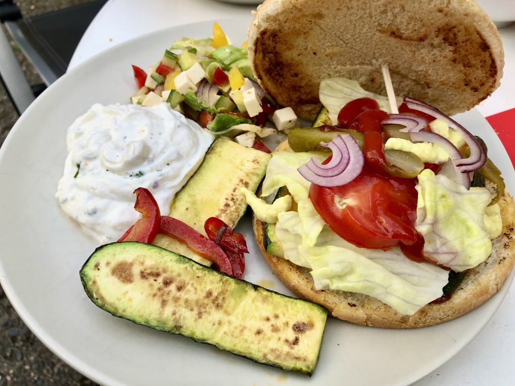 angebratene Zucchini, Paprika, Tomate, Zwiebel und Salat + leckere Soßen zwischen zwei Burger-Buns = großartig