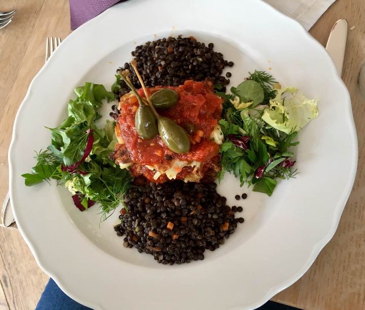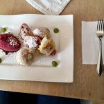 Heute haben wir wieder verdammt lecker gegessen. Hier: Heidemühle bei Dippoldiswalde. Vorspeise: Bouillon vom Kalb, Hauptspeise: saftig gebratenes Kalbsfilet auf mediteranem Gemüse und Kartoffelröstiburger mit Tomatensugo auf Beluga-Linsen, Desert: warme Erdbeeren in Tempura an Cassis-Sorbet und Birne Helene.