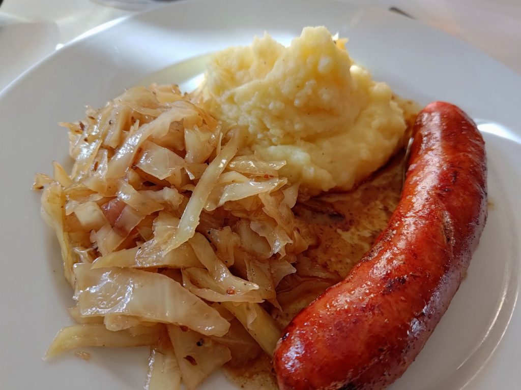 Was für eine wunderbare Kombination! Ich hätte ja gar nicht gedacht, dass mir das Bayrisch Kraut so gut gelingt. Zart süßlich, ein leichter Biss – einfach perfekt. Der Kartoffelstampf ist selbstverständlich auch selbstgemacht und sogar der Frau hat er offensichtlich gut geschmeckt. „Perfekt gelungen“ vernahmen meine Ohren nach dem Essen.