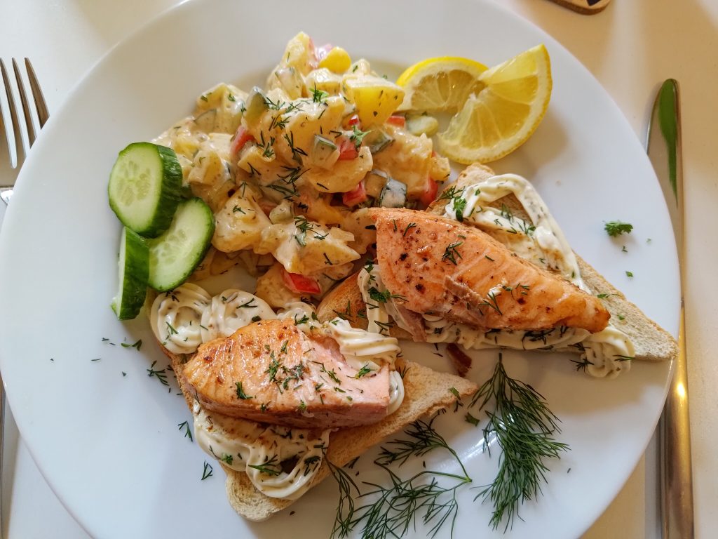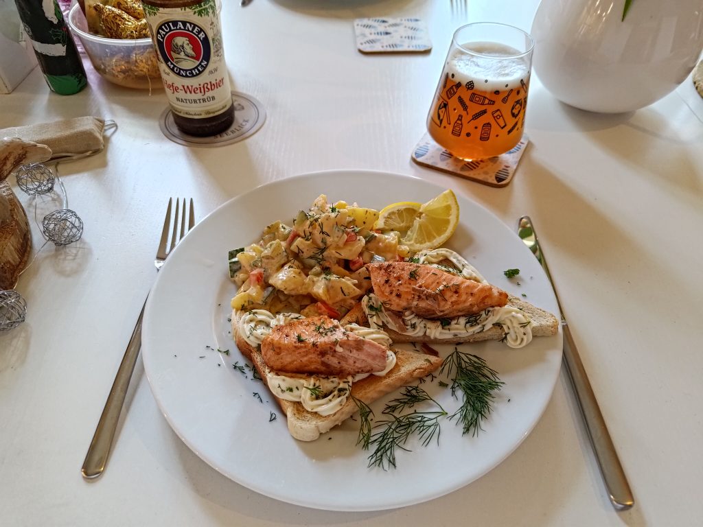 Das heutige Sonntagsgericht entsprang einer Inspriration aus dem Grill-Handbuch, welches ich zu Weihnachten geschenkt bekommen habe. Ultra simpel wird der Lachs einfach nur gut gewürzt, angebraten und mit einer Remoulade auf einem Toast angerichtet. Als Beilage habe ich noch einen Kartoffelsalat gemacht, da ich die entsprechenden Zutaten gerade zur Hand hatte. Trotzt Einfachheit war es sehr sehr köstlich.
