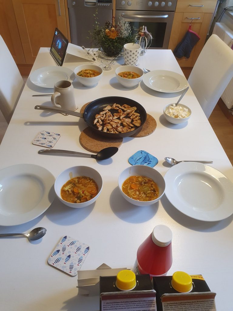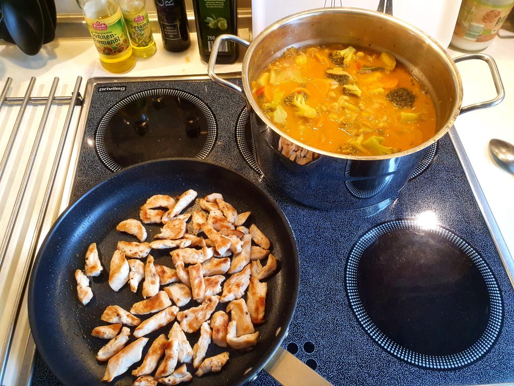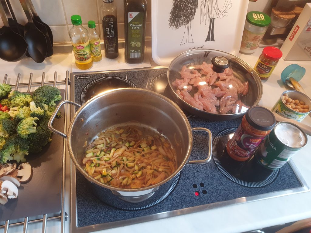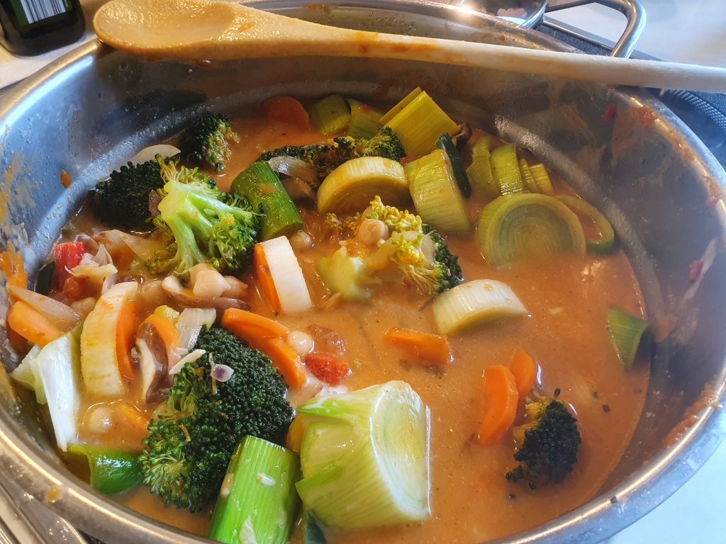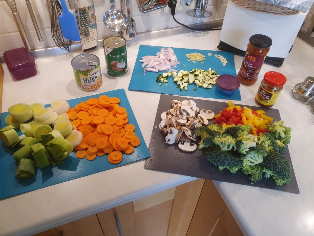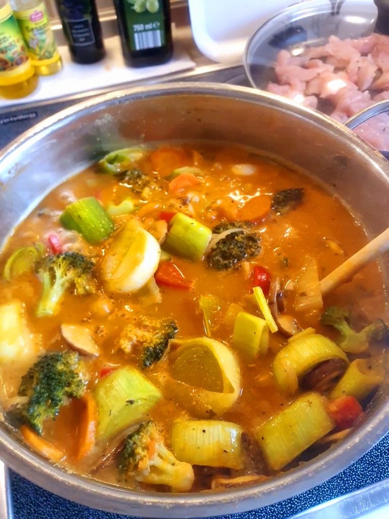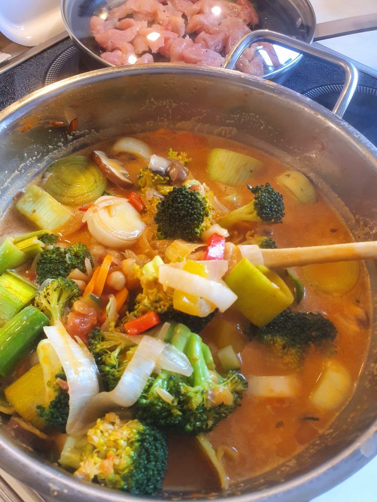 Heute habe ich mal fast alles Gemüse aus dem Kühlschrank verarbeitet. Naja, natürlich habe ich das schon so eingekauft, dass es für ein Curry geeignet ist. Habe mich dann aber zu einer Variante entschlossen, die auch für die Kids geeignet ist.