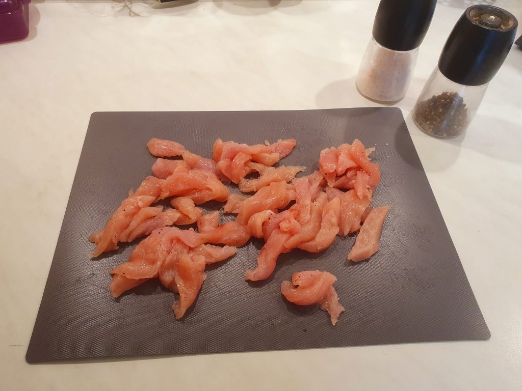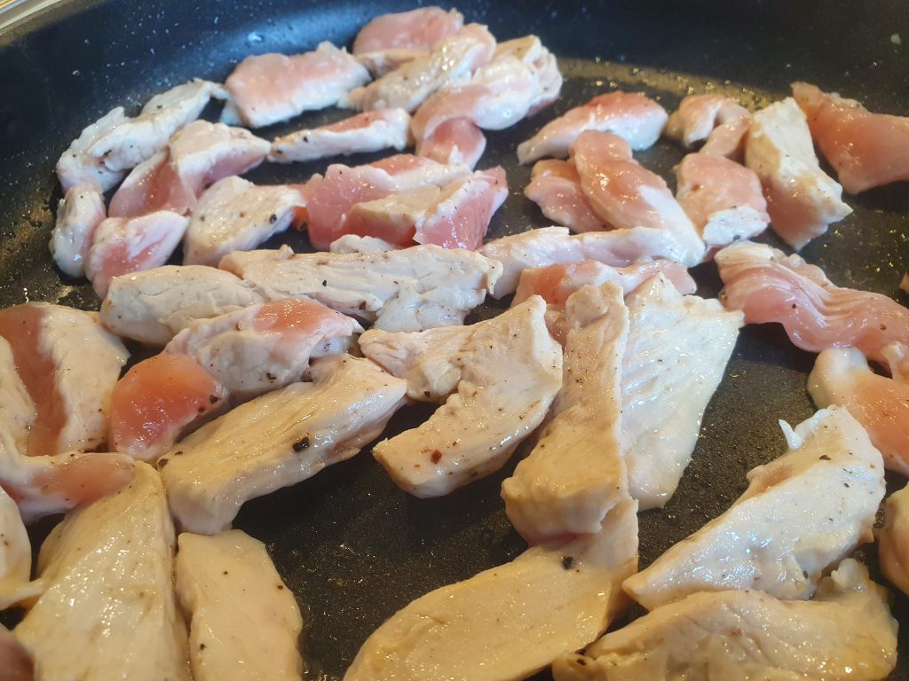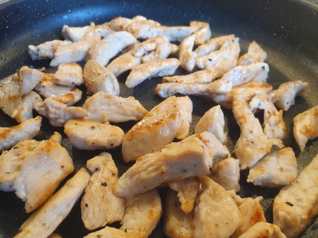Nicht ganz so scharf, etwas Putenfleisch dazu angegrillt und dann noch Weißen Käse gewürfelt dazugestellt.