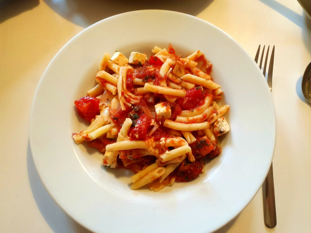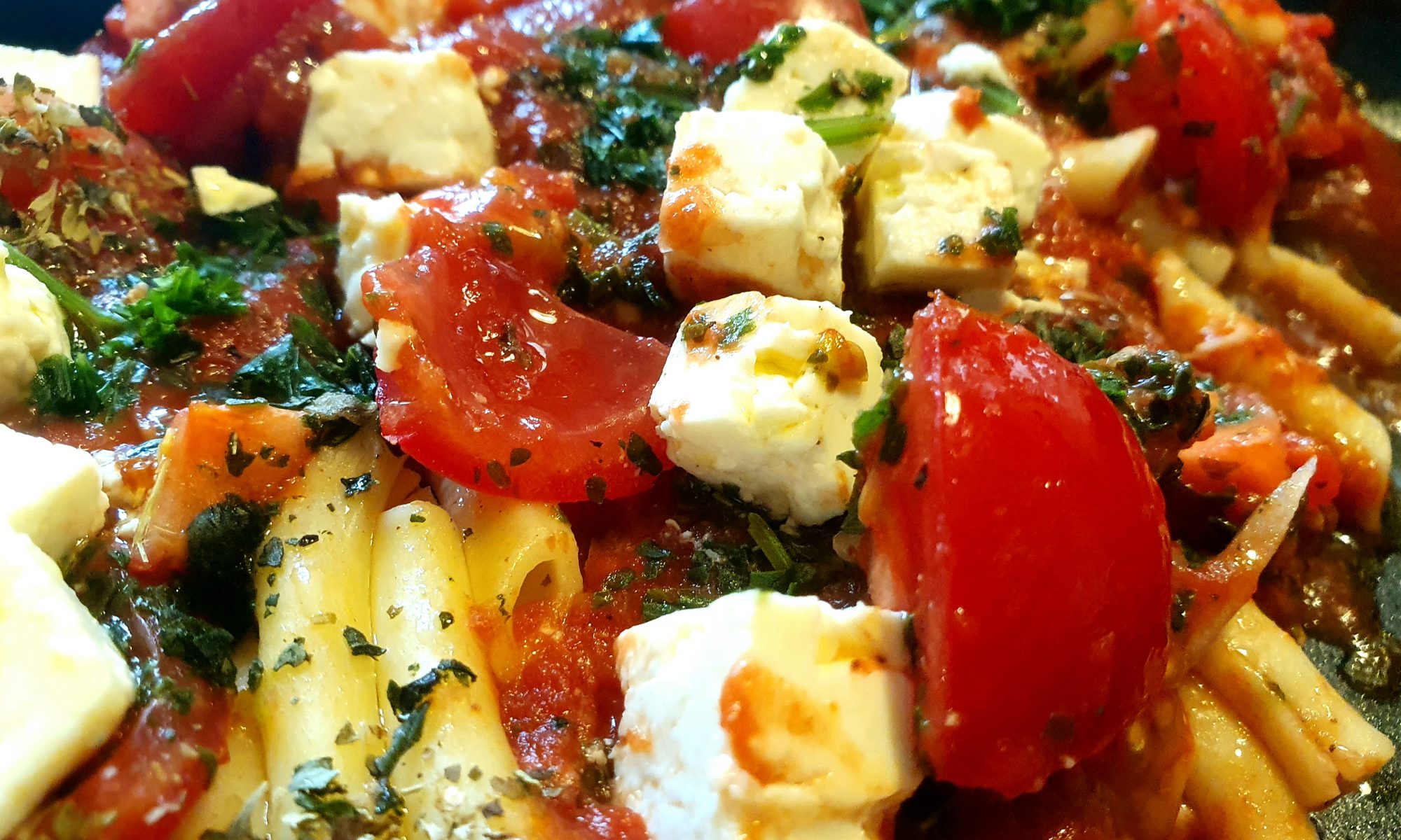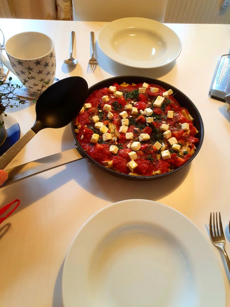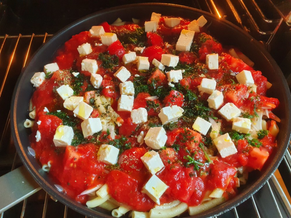 Das Gericht ist ganz einfach nachzumachen: Nudeln kochen, in einer gußeisernen Pfanne auf Olivenöl und etwas Tomatenmark einfüllen, eine Mischung aus Ei, Parmesan, Salz, Pfeffer, Muskat und Milch angießen, dann passierte Tomaten darübergießen, kleine Tomaten, viel Zwiebel und Knoblauch mit Basilikum und Petersilie dazugeben und die Feta-Würfel nicht vergessen. Noch etwas Chili dran und mit Salz und Pfeffer und ggf. Muskat sowie Kräuter der Provence abschmecken. Dann das Ganze für ein paar Minuten im Ofen übergrillen und schmecken lassen. Stinkt extrem nach Knobi aber ist auch extrem lecker!!!!