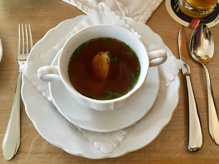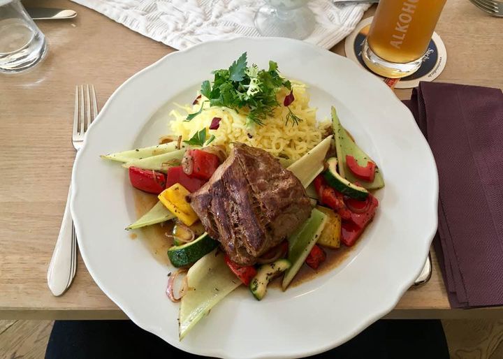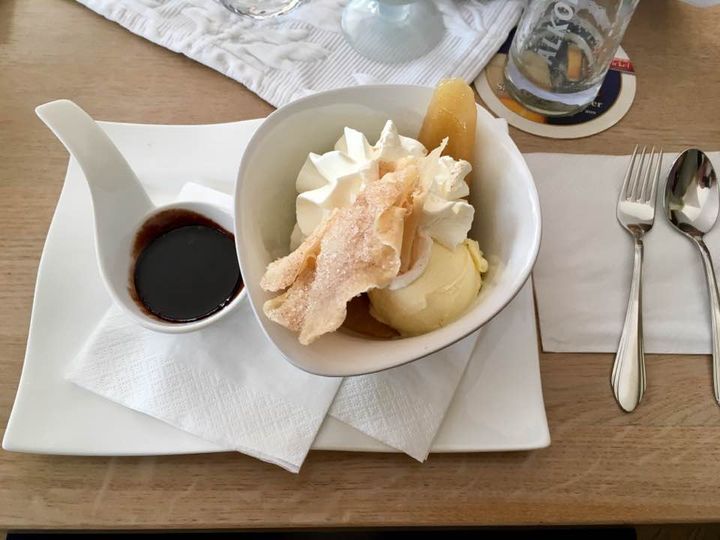 Heute haben wir wieder verdammt lecker gegessen. Hier: Heidemühle bei Dippoldiswalde. Vorspeise: Bouillon vom Kalb, Hauptspeise: saftig gebratenes Kalbsfilet auf mediteranem Gemüse und Kartoffelröstiburger mit Tomatensugo auf Beluga-Linsen, Desert: warme Erdbeeren in Tempura an Cassis-Sorbet und Birne Helene.
