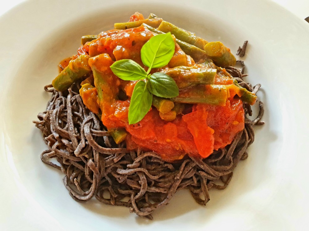 Die Schwarzen Spaghetti (Black Bean) habe ich heute mal mit grünem Spargel und ein wenig Tomaten auf den Teller gebracht. Die Spargelstücken sollten eigentlich angeröstet werden. Da ich aber zuerst Tomatenmark und Zwiebeln mit Öl in der Pfanne hatte, musste ich es mit Wasser ablöschen, sonst wären die Zwiebeln schwarz geworden. So wurden die Spargelstücken eben im Tomatensud gegart. Und damit es runder schmeckt habe ich noch paar Kirschtomaten dazugegeben und kräftig gewürzt. Es hat trotz fehlenden Röstaromen super geschmeckt, auch wenn ich heute auf den Knoblauch verzichtet habe. Nur der Frau haben angeöstete Pinienkerne gefehlt. Das wird bestimmt mit dem übrig gebliebenem Spargel morgen probiert.