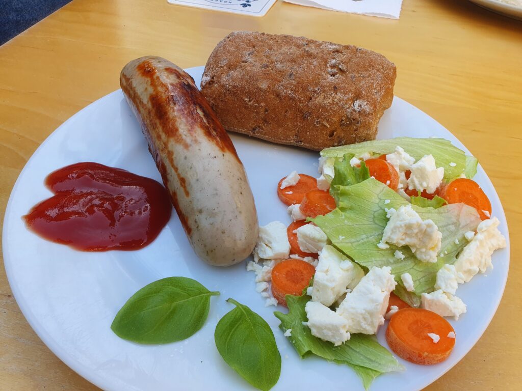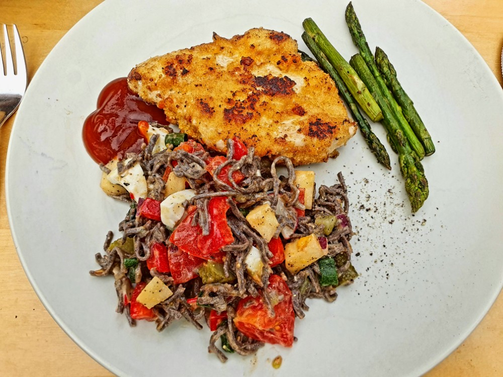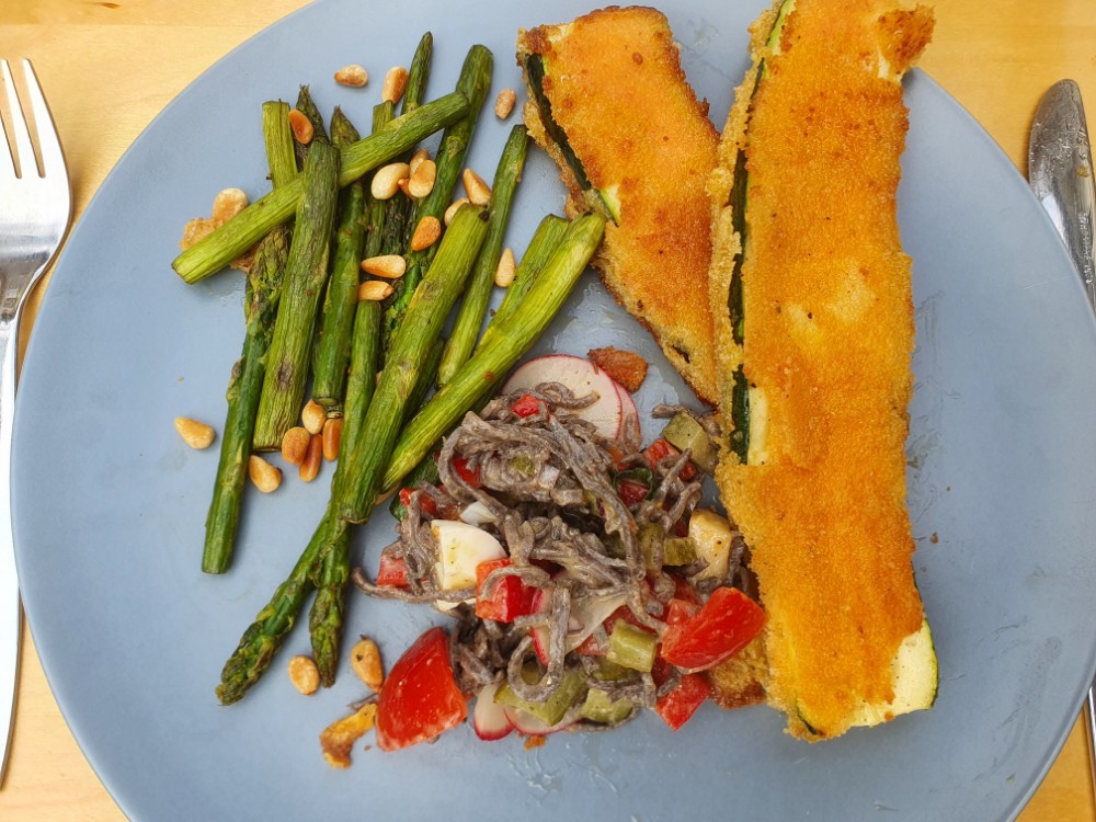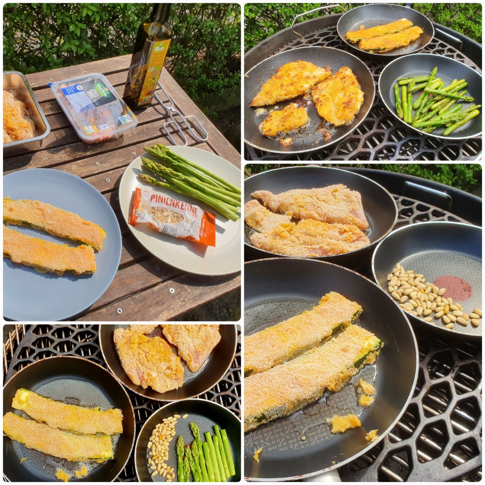 Am 1. Mai findet bei uns das traditionelle Familienfest der SPD im Fichtepark statt. Da wir nach 10 Minuten aber genug hatten von der Böhmischen Blasmusike (Rosamunde… 🥱) war für Bratwurst und Bier die гараж der bessere Ort. Da ich vorgesorgt hatte, war ein Nudelsalat, Puten- und Zucchinischnitzel mit gebratenem grünen Spargel und geröstete Pinienkerne schnell zubereitet. Fast alles war aus Resten gemacht, trotzdem hat es exzellent geschmeckt.