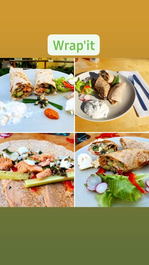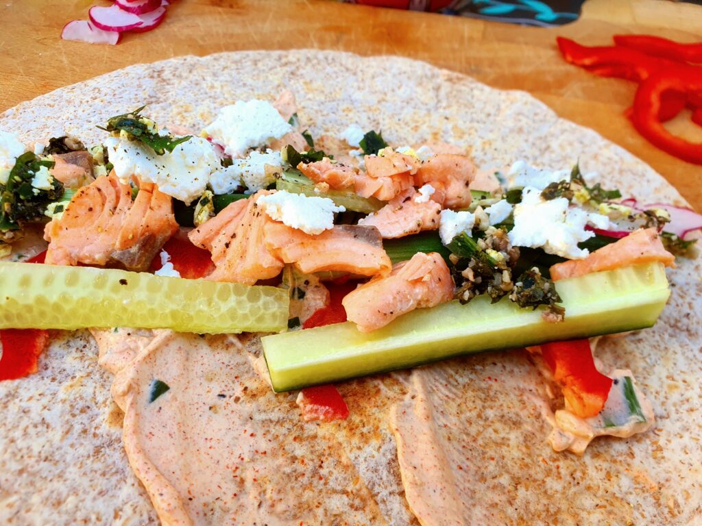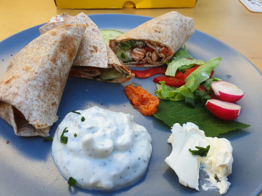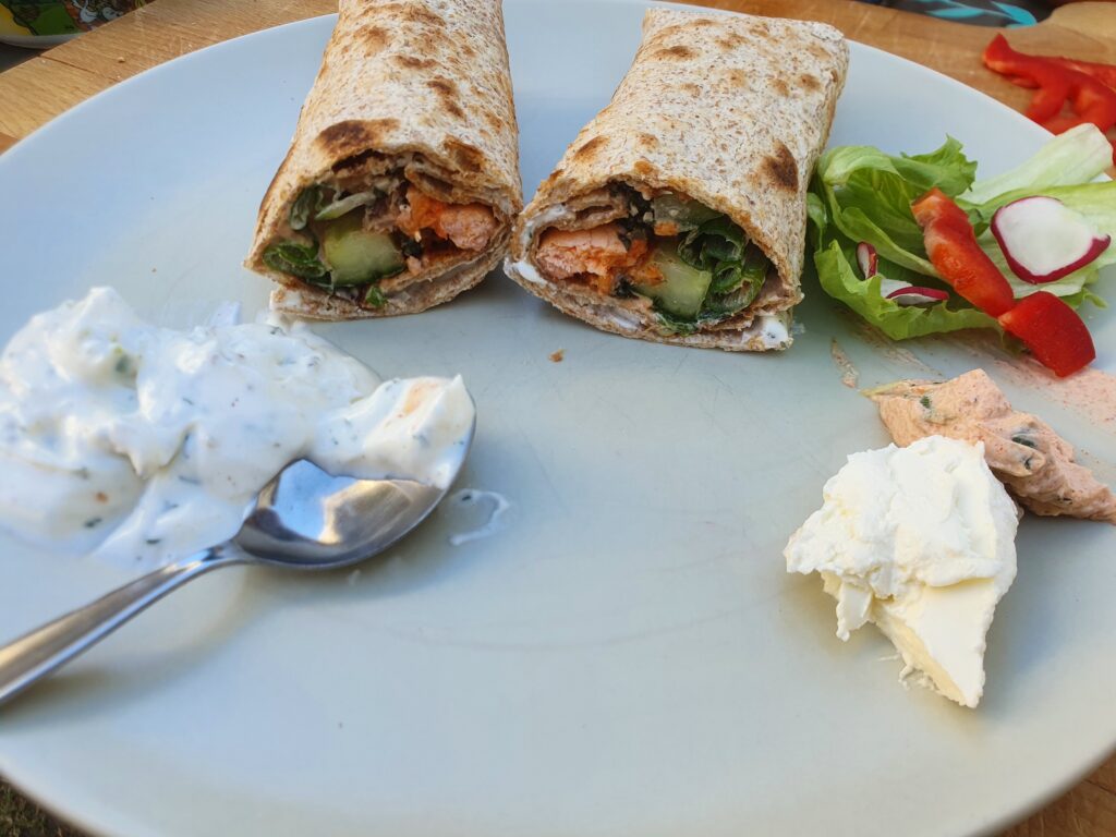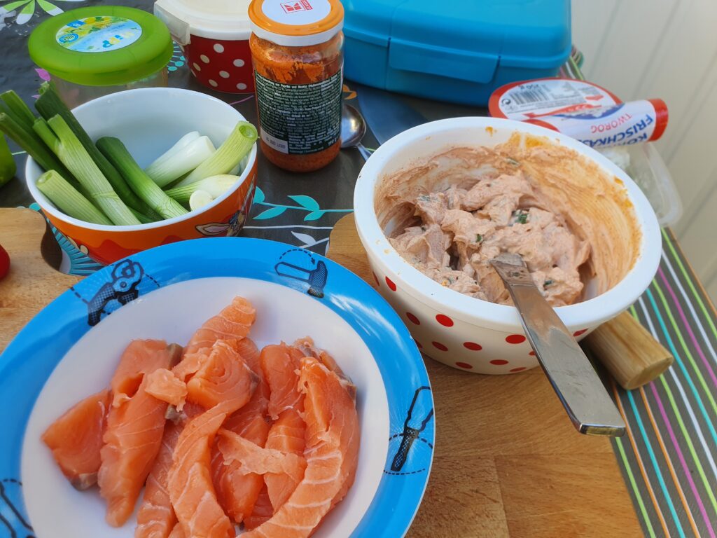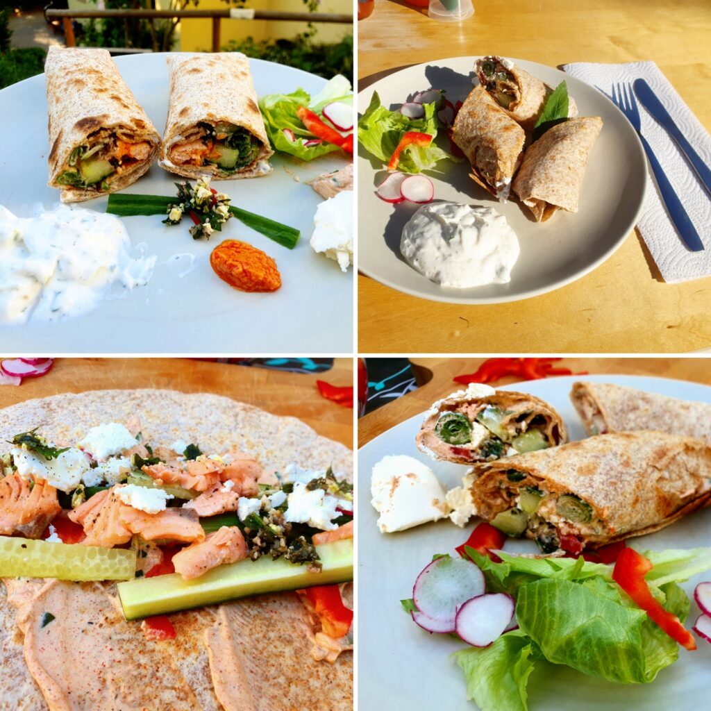 Wrap(s) – noch nie vorher selbst gemacht. Na gut, ausprobieren geht immer. Aber das Ergebnis war überraschend. Es hat wunderbar geschmeckt. Auch wenn dieser Teig nicht unbedingt meins ist, war es ultra lecker; so zumindest die Meinung der Gäste. Drinnen ist ein Frischkäse mit Paprika und Lauch, etwas Frühlingszwiebel, Gurke und Lachs. Ich habe den Lachs leicht angebraten, das fand ich passender als roh. Noch etwas mit Gewürzen, Paprikapesto und Quark sowie Frischkäse, Salat und Paprika angerichtet – fertig. Scheckt auch kalt! Auf jeden fall ein Gericht, was ich gerne mal wieder machen kann.