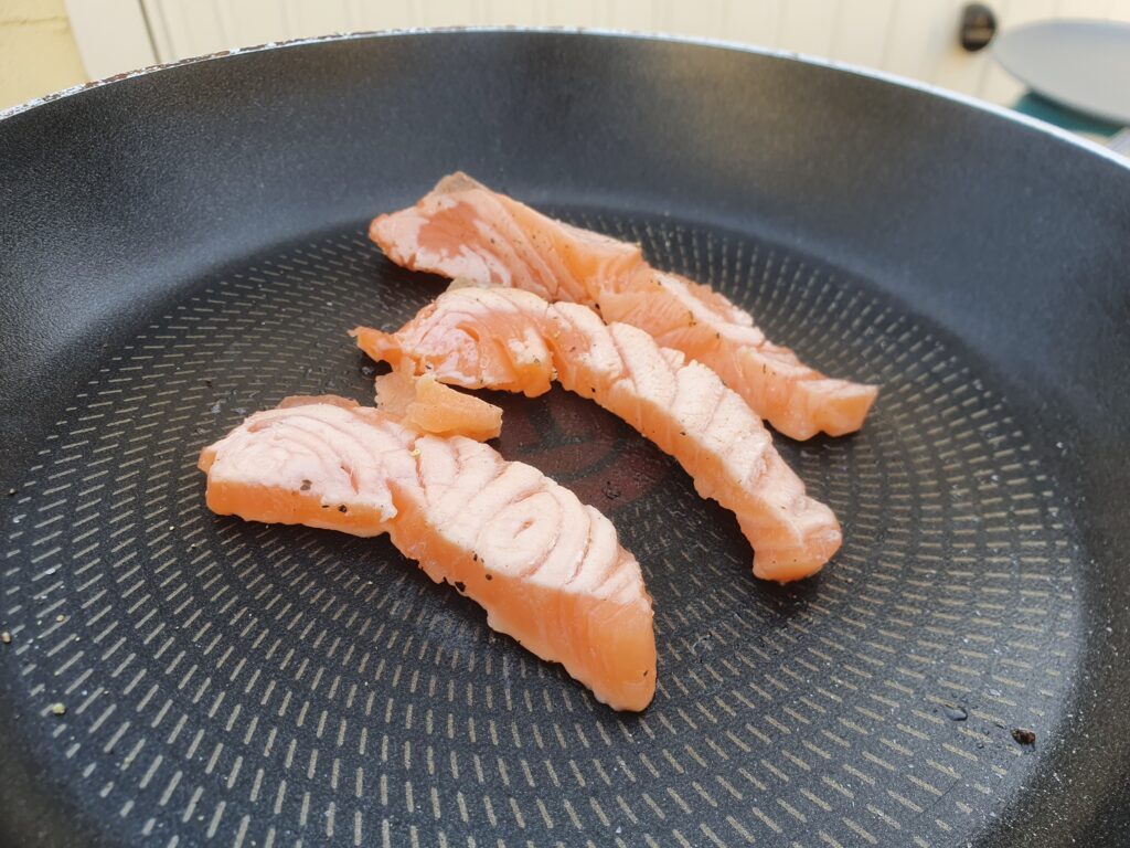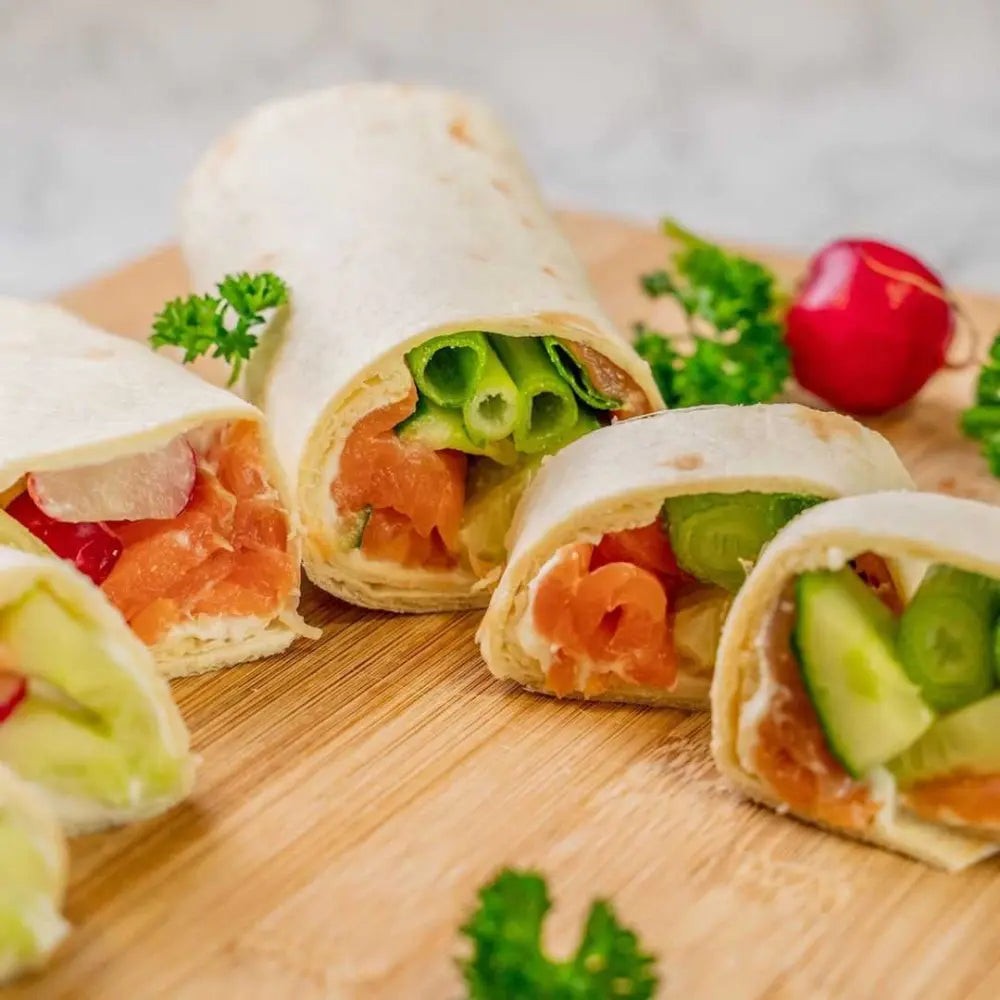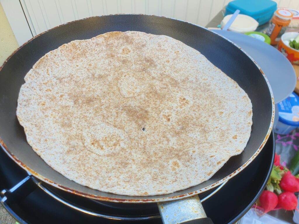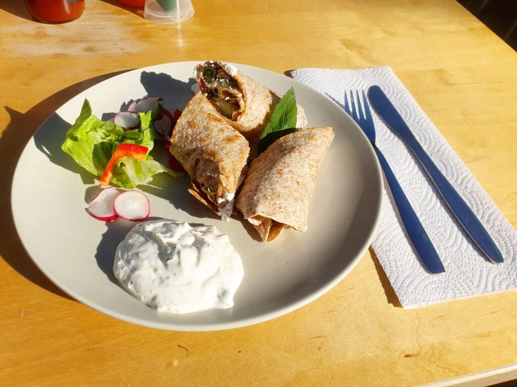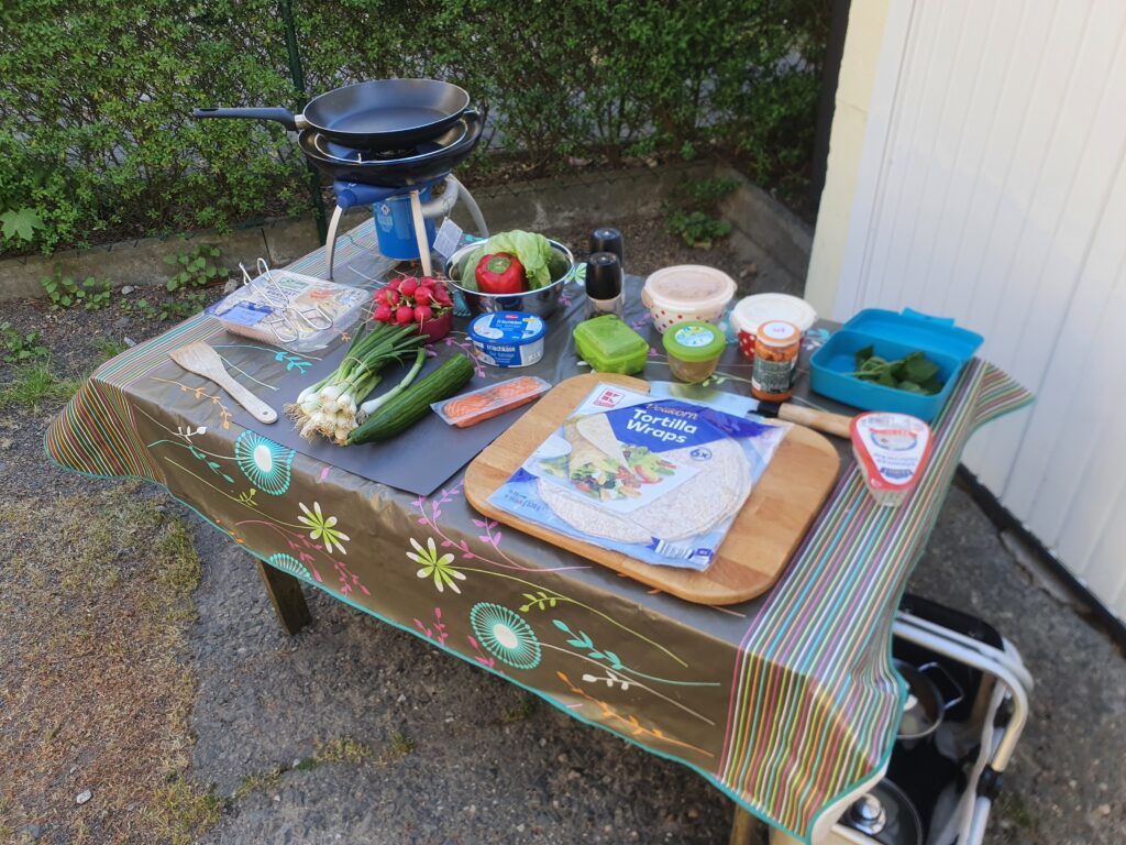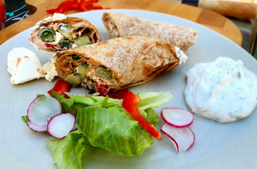 Wrap(s) – noch nie vorher selbst gemacht. Na gut, ausprobieren geht immer. Aber das Ergebnis war überraschend. Es hat wunderbar geschmeckt. Auch wenn dieser Teig nicht unbedingt meins ist, war es ultra lecker; so zumindest die Meinung der Gäste. Drinnen ist ein Frischkäse mit Paprika und Lauch, etwas Frühlingszwiebel, Gurke und Lachs. Ich habe den Lachs leicht angebraten, das fand ich passender als roh. Noch etwas mit Gewürzen, Paprikapesto und Quark sowie Frischkäse, Salat und Paprika angerichtet – fertig. Scheckt auch kalt! Auf jeden fall ein Gericht, was ich gerne mal wieder machen kann.