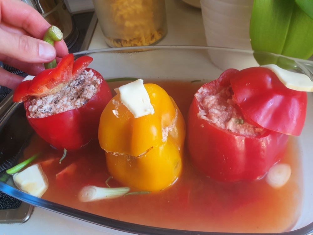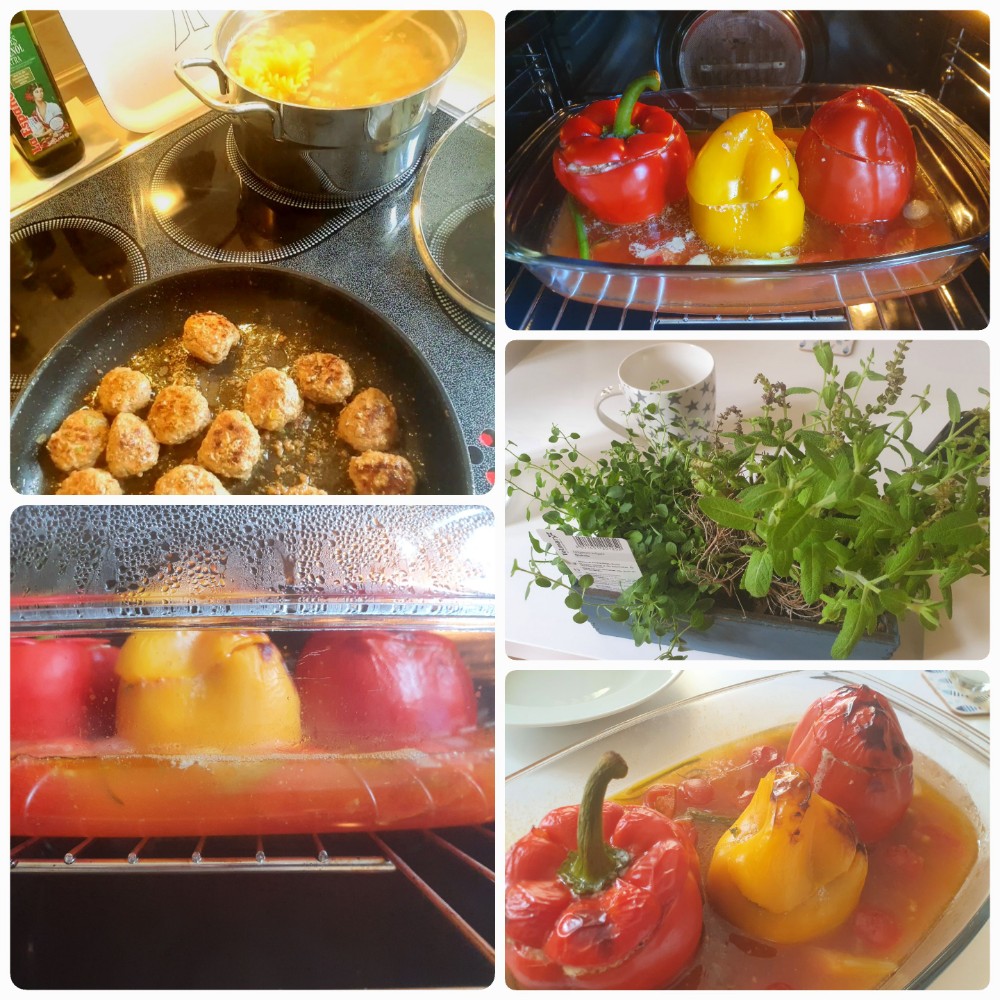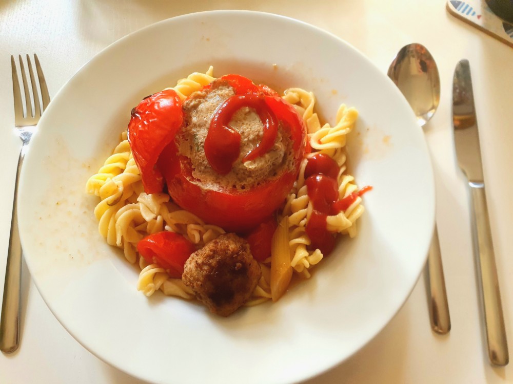 Auch Sonntags hab ich was leckeres gemacht. Die Paprikaschoten sind gefüllt mit gebratenen Chamignons und körnigem Frischkäse für die Vegetarier und einmal mit Hackfleisch für die Fleischfresser. Dieses Mal hab ich keinen Reis dazu serviert, denn die Nudeln wurden von den Kindern ohne Paprikaschoten gegessen, dafür aber mit Hackfleischbällchen.