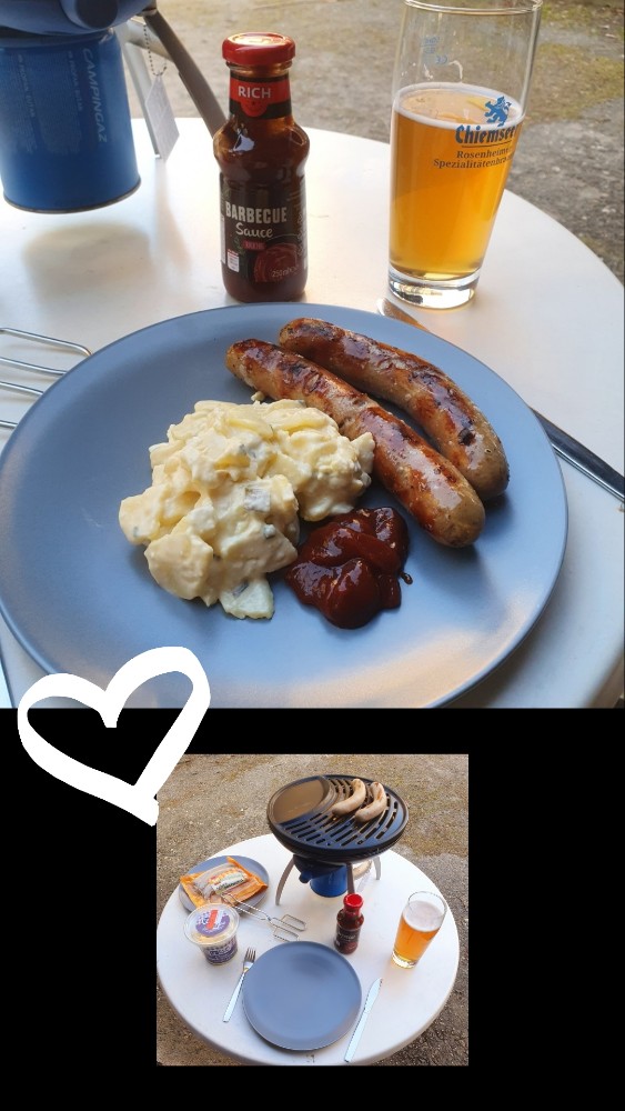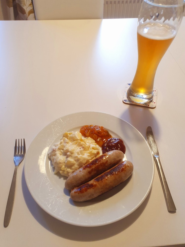 Außerdem waren noch Würstchen und Kartoffelsalat sowie ein fertiger Kebab-Salat übrig. Das gab es dann als Abendessen.