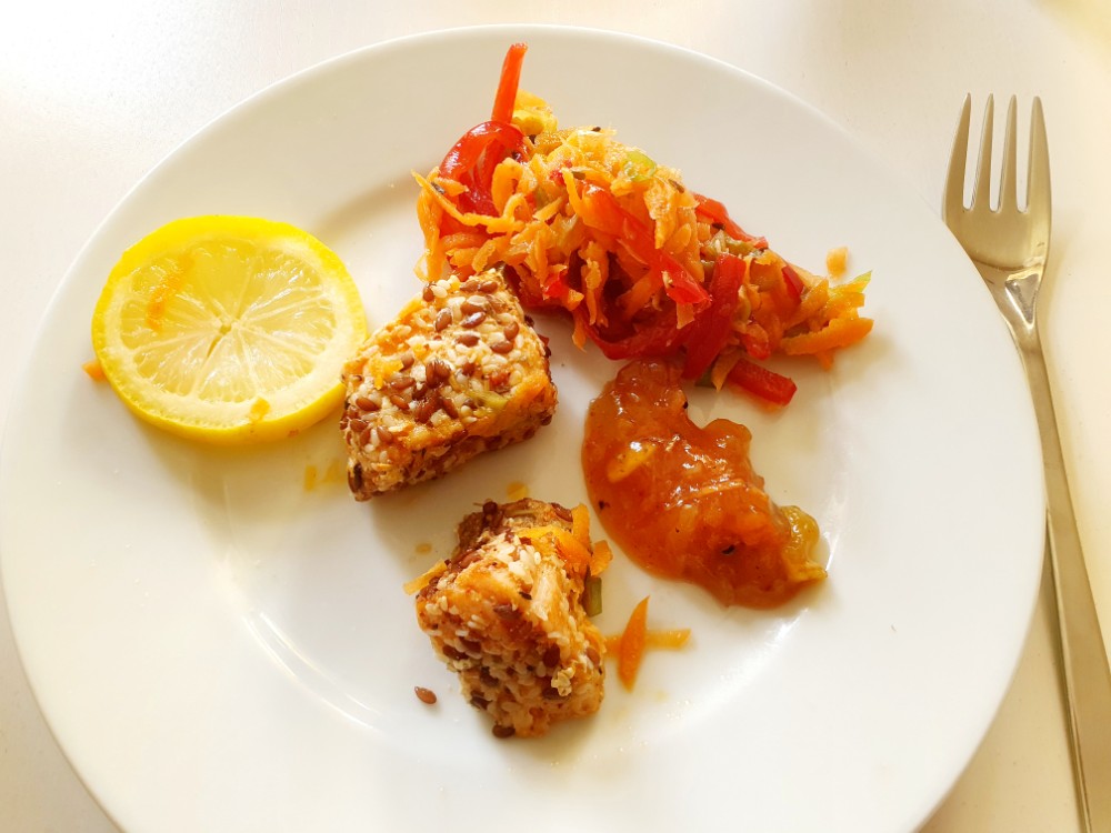 Am Sonntag sollte es ein Fisch-Gericht sein. Lachs schmeckt so herrlich – kurz in einer Honig-Senf-Dill-Marinde eingelegt – mit Reis und Buttermöhren angerichtet. Die Marinade war dann sogar noch als Soße sehr lecker, die zusätzliche Salatsoße (ebenfalls Honig-Senf) hatte es gar nicht gebraucht.