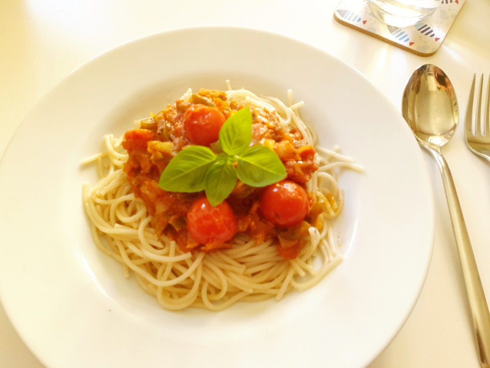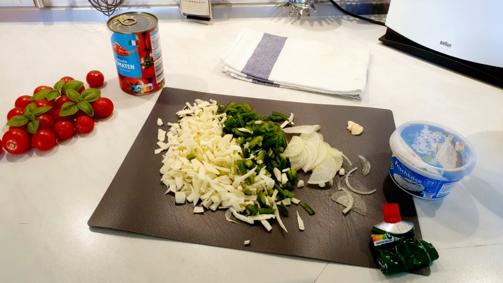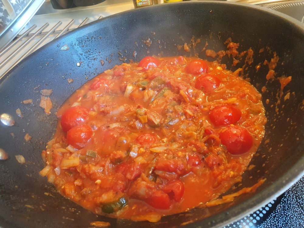 Die Soße besteht aus Zuccini, Chamingnons, gestückelter Tomate und körnigem Frischkäse. Alles schön in Tomatenmark, Zwiebel und Knobi angebraten und anschließend in der Auflaufform mit den Nudeln gemischt. 5 Minuten im Ofen überbacken und ja, die Käse-Scheibe hätte man weglassen können. Wir haben es genossen.