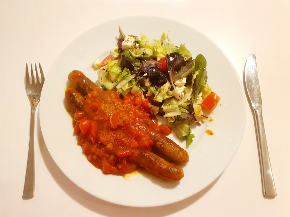 Würstchen mit Ei und dazu Salat – mein Fitness-Essen diese Woche. Na gut, Wurst gibts nur 2x in der Woche. 😬 Früh einen Joghurt mit Beeren und Abends ein Filinchen mit Käse. 2x EMS-Training bei Körperformen Dresden und ein Läufchen am Sonntag hab ich mittlerweile zum Standard-Wochenprogramm werden lassen. Nun versuche ich noch einmal die Woche ein Workout hinzubekommen. Mein Kumpel hat mir mal die Trainings von Sascha Huber empfohlen. Einige hab ich sogar schon mal durchgezogen. Mal sehen, ob ich das auch regelmäßig hinbekomme. Mein Ziel ist es, die 15% Körperfett und 41% Muskelmasse bei meinem Gesamtgewicht von 65kg zu halten!