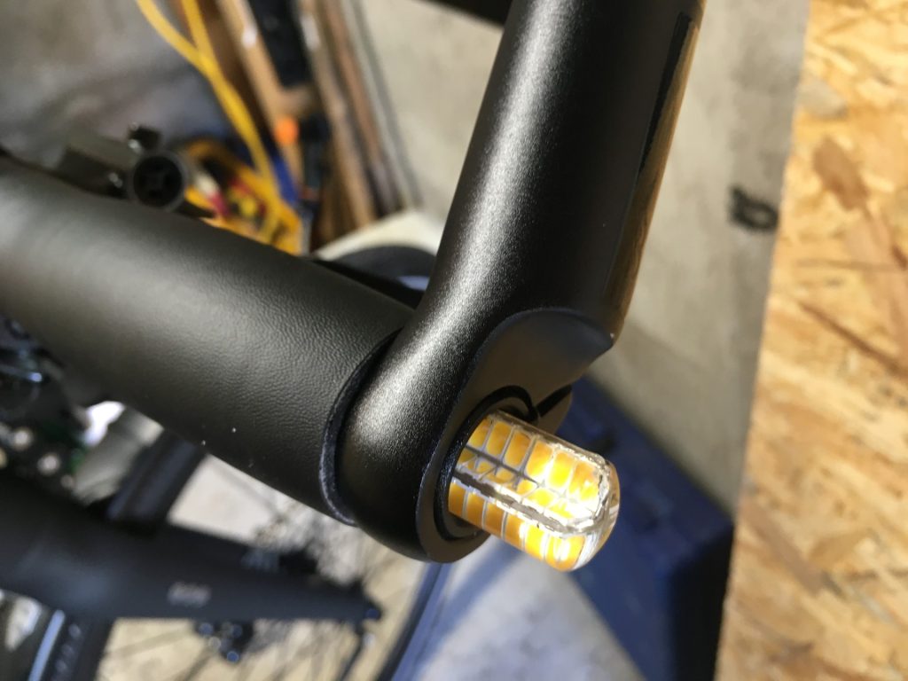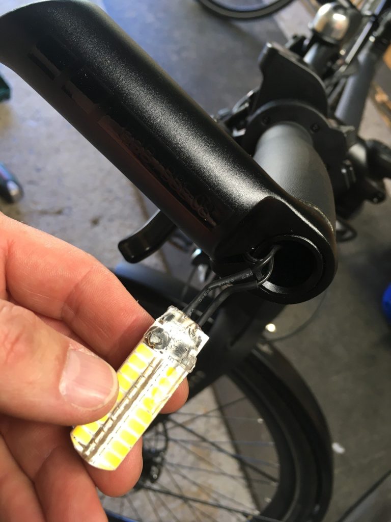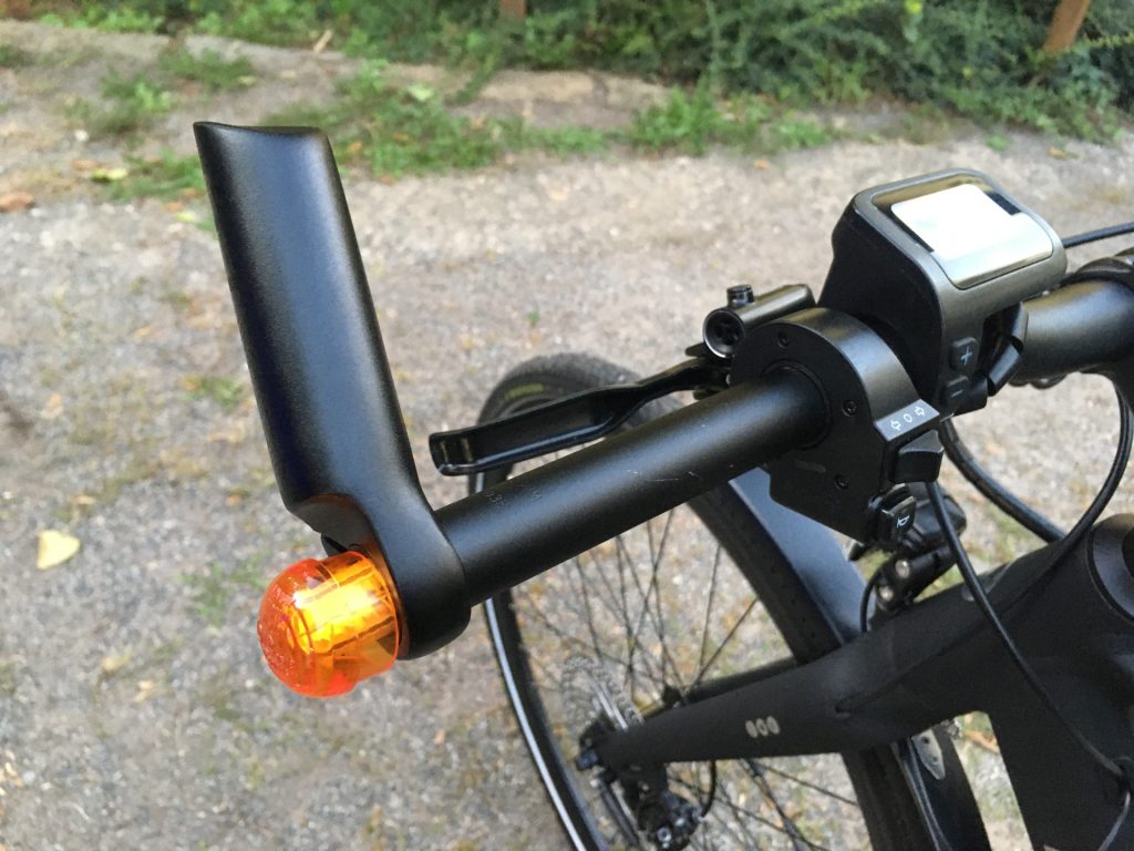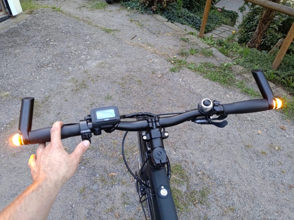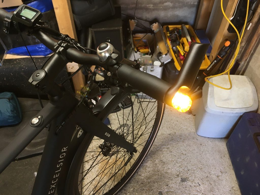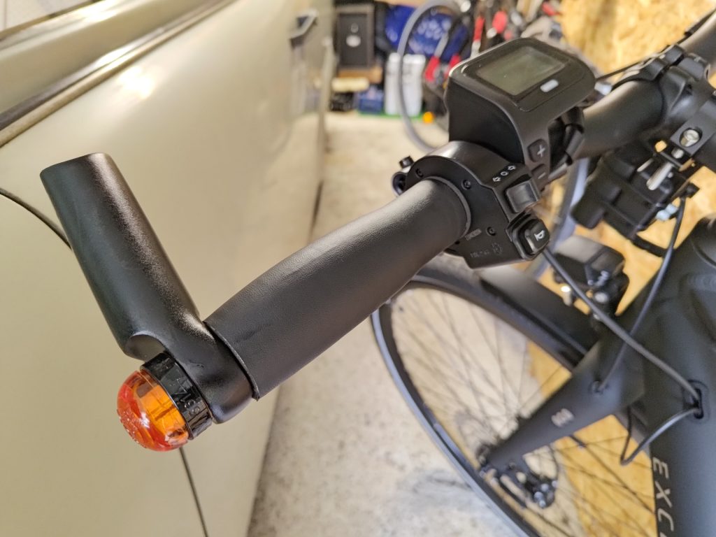 Ich lebe und arbeite in Dresden. Seit einem Jahr ist meine Arbeitsstelle ca. 10km von meinem Wohnort entfernt. Den Weg dahin lege ich gern mit dem Fahrrad zurück. Da mein bisheriges Bike so langsam das Zeitliche segnet, habe ich mir ein neues E-Bike gekauft. Das schlanke Urban-E der Marke Excelsior begleitet mich nun täglich 2x 30 Minuten durch die Stadt. Wie am alten Fahrrad, wünschte ich mir jedoch zur Erhöhung der Verkehrssicherheit Blinker und Bremslicht. An diesem Rad sollten die Anbauten möglichst sehr kompakt sein. Ich plante die Nutzung eines 2-Pol-Blinkrelais in Kombination mit einer 5000mAh Powerbank. Da KFZ-Technik mit 12V arbeitet, war noch ein StepUp-Converter nötig. Beides passte in eine kleine Box, die nicht mal so groß ist, wie die Powerbank. Eine passende Montagehalterung habe ich auch gefunden, an der ich später noch den Trinkflaschenhalter anbaute. Als Blinkleuchten nutzte ich 12V-LED Stecklampen, deren Silikonhülle genau im Lenkerrohr Halt fanden. Ohne Bohren oder sonstige Beschädigungen konnte ich die Kabel an den Griffen verlegen. Die kleinen orangen Plastekappen sind die Blinkergläser von einem Scooter. Kann man so im Internet bestellen. Beim Bremslicht war etwas Aufwand nötig, da dieses Rad keine Bremshebelkontakte besitzt, weil der Motor nicht rekuperieren kann. Ich besorgte Reed-Kontakte und positionierte sie und die zugehörigen Magnete an den Bremshebeln. Die Kabelverlegung zum Bremslicht war auch nicht ganz leicht, ich benötigte einen Fädeldraht um die Kabel im Unterrohr parallel zu den vorhandenen Leitungen durchzuziehen. Das Licht selbst ist von der Firma Büchel und hat eine integrierte Bremslichtfunktion. Leider habe ich das erst spät mitbekommen, offenbar funktioniert die ganz gut. Die Auslösung wollte ich aber dennoch vom Zug am Bremshebel abhängig machen und baute es so wie geplant an. Nun bin ich erst einmal zufrieden und denke, dadurch etwas sicherer unterwegs zu sein. Wenn man das eine Video hier anschaut, leuchtet es zumindest genau so, wie am alten Fahrrad.