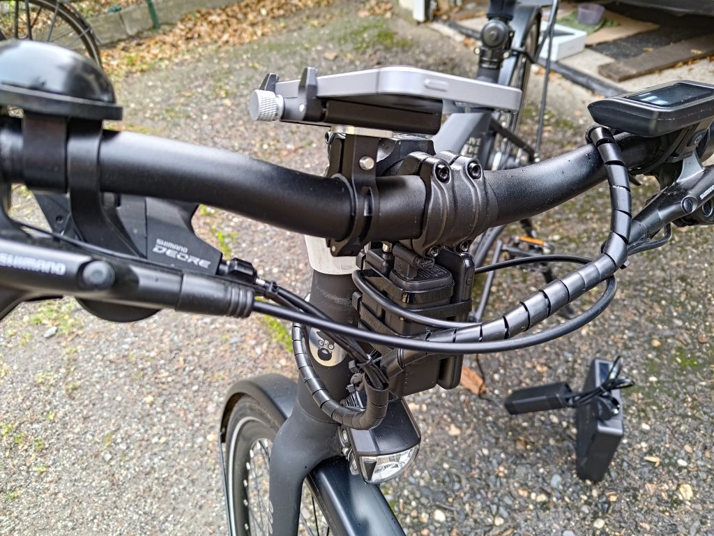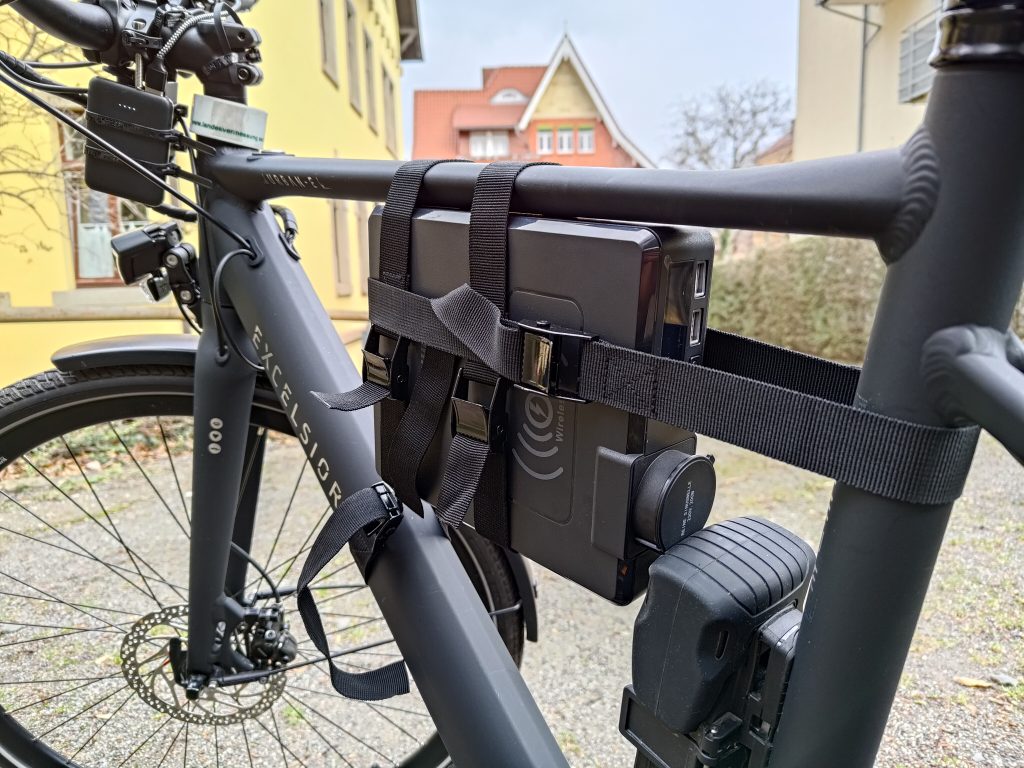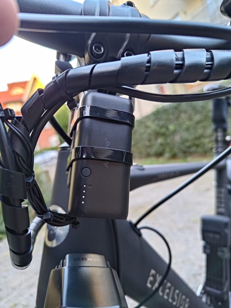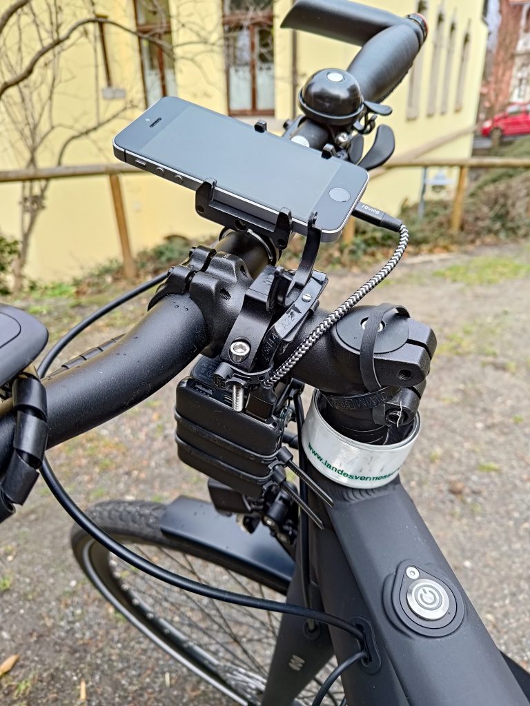 Für die Navigation würde ich natürlich gern mein iPhone nutzen. Da der Akku des Gerätes aber nicht mehrere Stunden durchhält, habe ich dafür auch noch einmal eine Powerbank mit 5000 mAh besorgt und am Rad befestigt. Außerdem befindet sich nun am Lenker eine sehr kräftige Handyhalterung. Damit kann eigentlich nichts mehr schiefgehen.