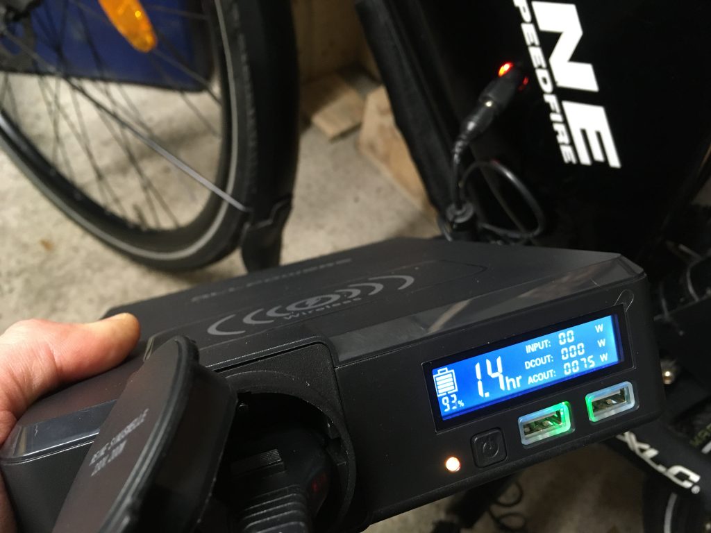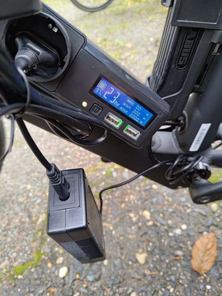 Als ich die Powerstation an mein altes eBike anschloss, wurden ca. 75W gezogen, was laut Anzeige für ca. 1,5h halten sollte. Das Netzteil des neuen Rades hat ca. die gleiche Leistungsklasse. Was es wirklich zieht, kann ich allerdings erst testen, nachdem ich die restlichen ca. 80km runtergefahren habe. Die realistische Reichweite nach mehreren Fahrten zur Arbeit liegt jedoch bei ca. 60km. Dabei sind aber nur leichte Steigungen einkalkuliert, welche die Reichweite natürlich deutlich beeinflussen. Aber wie gesagt, der Test unter realen Bedingungen folgt noch.