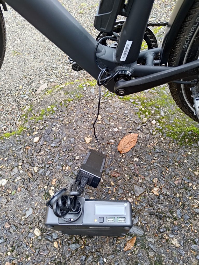 Im Sommer des Jahres 2024 wird die Klassenfahrt unseres Sohnes Alexander stattfinden. Damit das Ganze ein wirkliches Erlebnis wird, hat sich die Klasse gedacht, keine Standard-Fahrt mit einem Reiseunternehmen durchzuführen, sondern alles selbst zu organisieren. Geplant ist eine Fahrradtour zum Ferienpark Stausee Quitzdorf (in der Nähe von Görlitz). Die Entfernung beträgt ungefähr 100 km. 8 Schüler und Schülerinnen wollen lieber mit öffentlichen Verkehrsmitteln fahren, alle anderen wollen das Abenteuer wagen. Ich habe mich bereiterklärt, die Tour als Radler zu begleiten und dabei mit Reparatur- und Navigationsfähigkeiten zu unterstützen. Für 100km ist keines meiner eBikes ausgelegt, ich müsste auf jeden Fall zwischenladen. Da ich aber so unabhängig wie möglich sein möchte, recherchierte ich nach einem zusätzlichen Akku bzw. einer PowerBank mit 230V-Ausgang. Die Chinesen machen alles möglich, auch die 200W starke aber ultra-kompakte ALLPOWERS Tragbare Powerstation, die eigentlich für Solarpanels gedacht ist. Ich habe außerdem für mein neues Bike ein zweites Netzteil besorgt, welches ich immer in meiner Fahrradtasche habe – falls es mal eng wird. Die Powerstation habe ich heute am fast vollen Akku angeschlossen und konnte zumindest die restlichen 2-3% des eBike-Akkus schnell vollladen. Natürlich muss ich das ganze noch testen, wenn der Akku fast leer ist, bin aber zuversichtlich, dass es mindestens für eine komplette Ladung reicht. Die Anzeige an der Powerstation zeigt wunderbar die entnomme und auch die eingespeiste Leistung, den Ladezustand des Akkus und die verraussichtliche Entladedauer an. Um diesen Zusatzakku zu transportieren überlegte mich mir erst einmal eine eher provisorische Montage mit Spannbändern, daran werde ich noch feilen. Schließlich kann es ja auch mal nass werden und das Gerät sollte dabei keinen Schaden nehmen.
