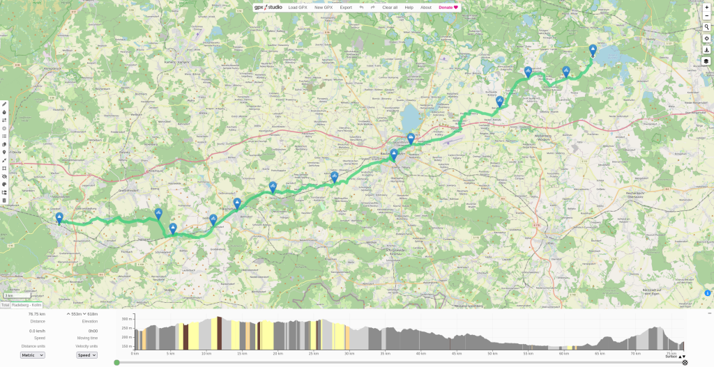 Damit der Leitwolf der Radlertruppe die richtige Strecke findet, empfehle ich, mit dem Handy und der App „Guru Maps“ zu navigieren, was ich als Schlusslicht übrigens auch machen werde. Für die Verständigung zwischen mir und der Spitze besorge ich noch ein Paar Funkgeräte. Die Route stelle ich in mehreren Dateiformaten hier zur Verfügung. GPX verstehen die meisten Navigations-Apps und kann in gpx.studio geladen werden, KML kann in earth.google.com geladen werden und wer gern nach Komoot fährt, dem gebe ich die Strecke auch dort frei.