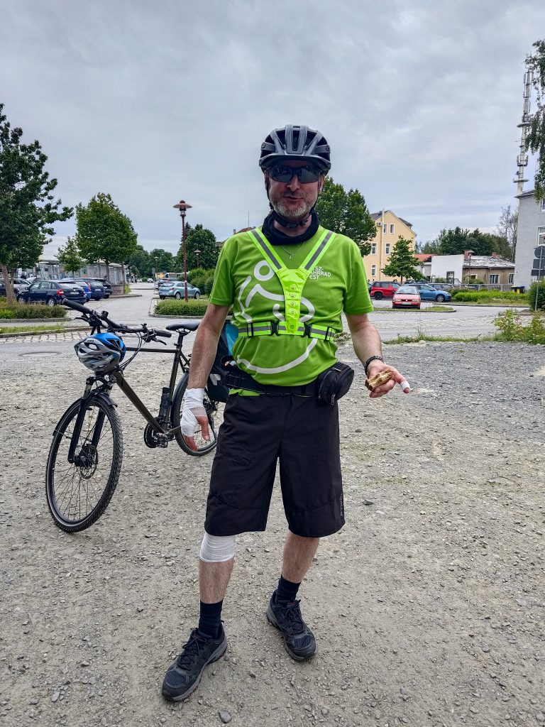 Am Freitag, den 14.06.2024 traten wir die Heimreise an. Von den 12 Radfahrern auf der Hinfahrt, trauten sich 7 Leute auch die Rückfahrt mit dem Rad zu. Wir starteten gegen 09:30 Uhr und erreichten auf gleicher Strecke recht bald den ersten Pausenpunkt in Baruth. Dort wartete wieder Essen auf Rädern mit Picknick und Getränkeversorgung auf uns. Nach einem eher kurzen Stopp in Bautzen fuhren wir nach Bischofswerda. Kurz vor dem Bahnhof bin ich dann leider gestürzt und musste mich erst einmal notdürftig verarzten (schmerzhaft). Glücklicherweise hatte ich die große Sanitasche dabei, so dass es mit zwei Binden und etwas Pflaster dann nach einer halbstündigen Erholungspause weitergehen konnte. Einige Teile meines Fahrrades hatten es leider nicht überlebt, so dass ich eine Fahrradtasche der Autobegleitung mitgeben musste. Genau so war es ja auch gedacht und somit für alle Eventualitäten gesorgt. Um 17:30 Uhr fuhren wir im Bahnhof Radeberg ein und überlegten ein letztes Mal, wie wir alle nach Hause kommen. Wir entschieden uns, gemeinsam den restlichen Weg bis Dresden auch mit dem Rad zu fahren. Es würde ja nur noch bergab gehen. Entlang der Dresdner Heide bis zum Ullersdorfer Platz lief es richtig gut. Die Grundstraße war eine Herausforderung für die Bremsen. Schließlich trennten wir uns am Blauen Wunder, wo ich die Kids in die Ferien entlies. Bis nach Hause war es dann doch noch einmal anstrengend, da es wieder leicht den Berg hinauf ging und alle kaum noch Sitzpolster hatten.