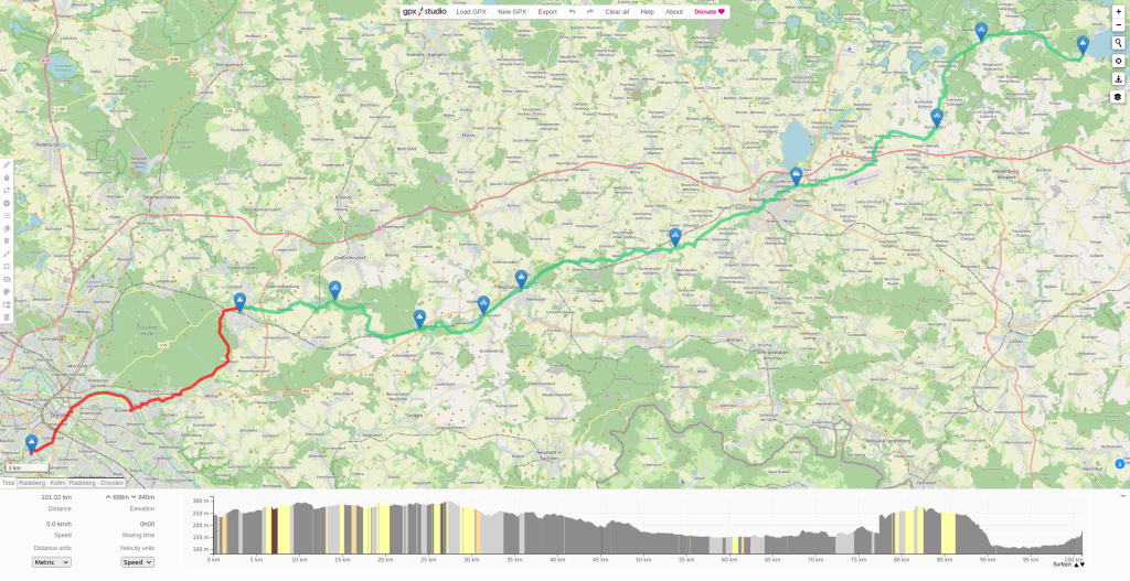 Nach einer kürzlich erfolgen Testfahrt der 1. Etappe habe ich die gewonnenen Erkenntnisse zur Strecke bereits in die Routenplanung eingearbeitet (ein Großteil der Massenei und die Flussquerung der Wesenitz in Großharthau wird umfahren).