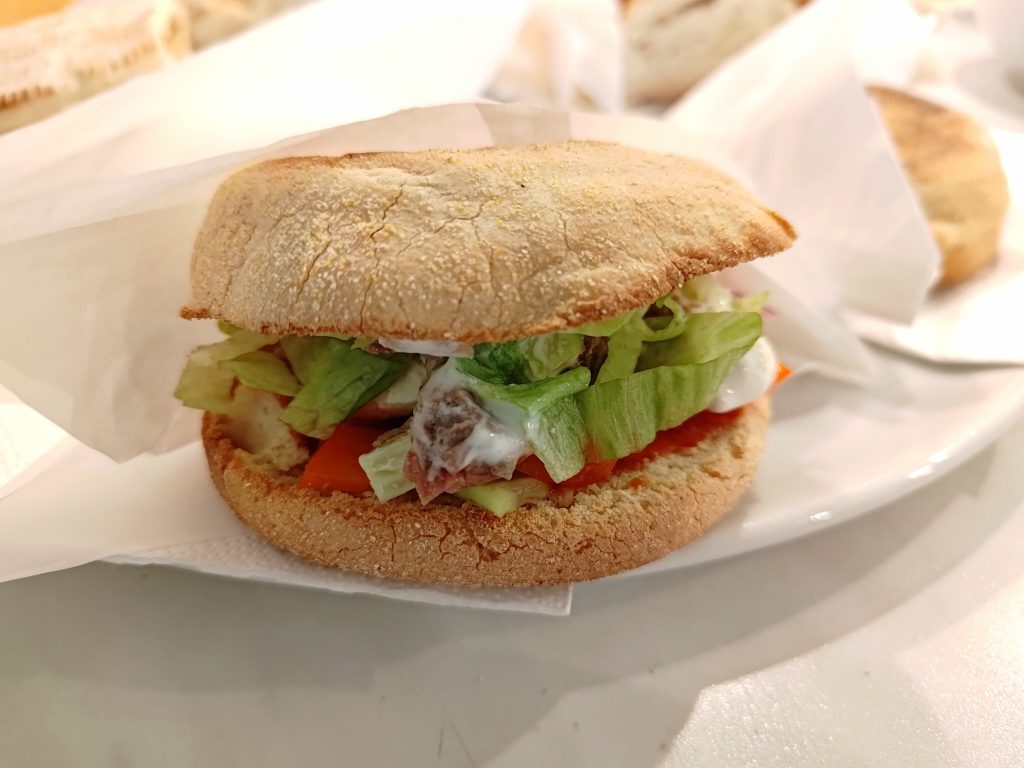 In Vorbereitung einer Feier mit vielen Personen, tüftelte ich die Tage an einer Möglichkeit, eine Döner-Mahlzeit so vorzubereiten, dass der herstellende Dönermann vor Ort keine oder nur wenig Arbeit hat. Ich wollte also Döner als kalte Snack-Variante „vorproduzieren“. Abgeleitet von meinem bewährten Rezept stellte ich die Zutaten zusammen und brauchte jetzt eigentlich nur noch die Mengen entsprechend anzupassen. Die Herstellung der Gewürzmischung gelang ohne Anpassung sehr schnell. Klar war auch die Soße und das Gemüse. Beim Fleisch allerdings musste ich wirklich etwas experimentieren. Da ich für eine vorbereitete Dönervariante nicht unbedingt den normalen Dönergrill anwerfen wollte, suchte ich nach „Mini-Döner“ im Netz. Dabei stieß ich auf folgenden Link und arbeitete das Ganze kurzerhand genau so ab. Da es recht gut gelang – zumindest macht der Spieß optisch echt was her – entschied ich mich, das bei der Feier auch so zu machen. Später bei der Zusammenstellung merkte ich allerdings, dass der Spieß keineswegs im Ofen durchgegrillt wurde und entschloss mich, bei geplanter Ausführung – in Vorbereitung der Feier – nur einen Spieß für die Optik zu machen. Das Fleisch, welches in die Döner gefüllt werden soll, wird in einer Pfanne angebraten. Den Spieß stelle ich dann nur als optisches Highlight hin, wie auf dem einen Foto zu sehen ist. Nun waren aber noch die richtigen Brote zu finden. Dazu hatte ich folgende Ideen: Toasties, kleine Pita-Taschen und geteiltes, normales Dönerbrot. Alle 3 Sorten probierte ich aus und musste feststellen, dass das normale Dönerbrot am wenigsten geeignet ist. Man muss es vor dem Verzehr erhitzen, so dass es dünner wird und besser zusammenhält. Das gelingt ganz gut bei der normalen Dönerherstellung im Sandwich-/Waffel-Maker. Mit dem Toaster besteht aber keine Chance, es passend anzurösten. Die Pita-Taschen funktionieren auch im Toaster ganz gut, allerdings war mir der Anteil an Weizenbrot im Vergleich zur einfüllbaren Füllung zu hoch. Da hat man zu viel zu kauen dran. Meiner Meinung nach am besten passten die Toasties. Ich habe Dinkel-Toasties geholt, die haben einen wunderbaren Geschmack, sind nicht zu groß und lassen sich gut handhaben. Dann experimentierte ich noch etwas mit Frühstückstüten herum und stellte kleine Dönertaschen her. Zusammen mit einer Serviette kann man die kleinen Dönersnacks sogar in einer Brotdose verstauen und transportieren. Und so können sie dann auch kalt verzehrt werden.