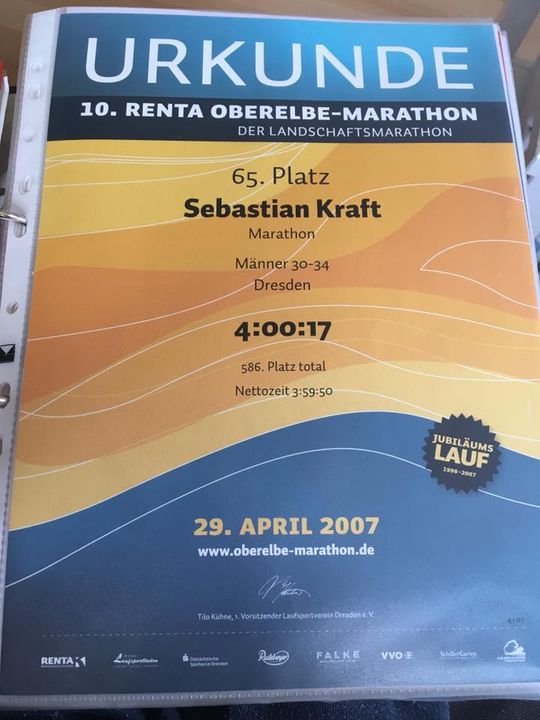 DafĂŒr hier ein Bild von vor 10 Jahren. Das war mein Finisher-Bild vom Oberelbe-Marathon – Strecke: 42,195km Zeit: 4:00:17 h