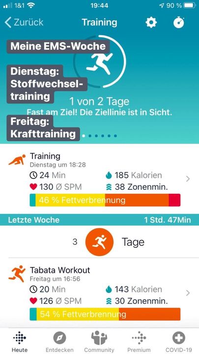 Nachdem ich nun regelmäßig 2x pro Woche zum EMS-Training gehe, wollte ich auch da mal etwas Abwechselung reinbringen. Da bot sich das Angebot meiner Trainerin geradezu an, heute mal das „Stoffwechselprogramm“ zu testen. Wir haben 10 Minuten das normale „Kräftigungsprogramm“ durchgezogen und dann wurde zum Ausdauersport unter Ausdauerstromimpulsen gewechselt. Das war mal eine ordentliche Herausforderung! Hat aber echt Spaß gemacht und ich werde es sicherlich nicht bei einem Mal belassen. 🏋🏻♂️