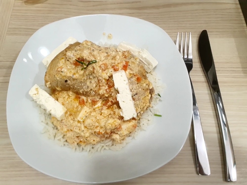 Was? Fleisch – als Pfannkuchen? Na klar, das geht. Ich verrate mal das Geheimnis: Nimm ein Paar Schweinerouladen und breite sie auf einem Küchenbrett aus. Würze mit Pfeffer, Salz und rosenscharfem Paprika oder was dir sonst gerade in die Finger kommt. Brate jede Seite in Butter und Olivenöl an. Danach nimmst du die Fleischpfannkuchen heraus und lässt sie etwas abkühlen. Damit das ganze eine gut essbare Form in Kombination mit Gemüse und Käse bekommt, wickelst du die Pfannkuchen einfach wieder zu einer Roulade zusammen. Ich habe mich für Möhrenraspel und Feta entschieden, anderes Beiwerk geht selbstverständlich auch. Dann wird in der Pfanne noch ein Sößchen von Sahne, Butter, einem halben Brühwürfel und etwas Wasser gezaubert. Die Rouladen dürfen dafür gern noch mal mitschoren. Nach 2 Minuten mit Deckel drauf ist das Gericht fertig.