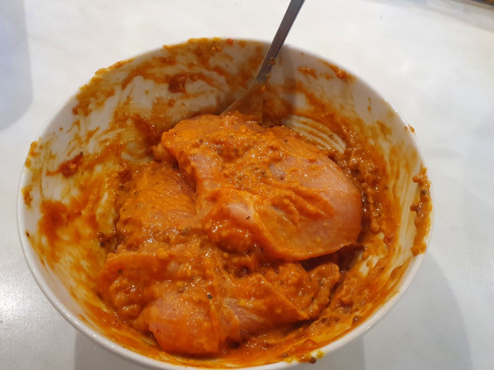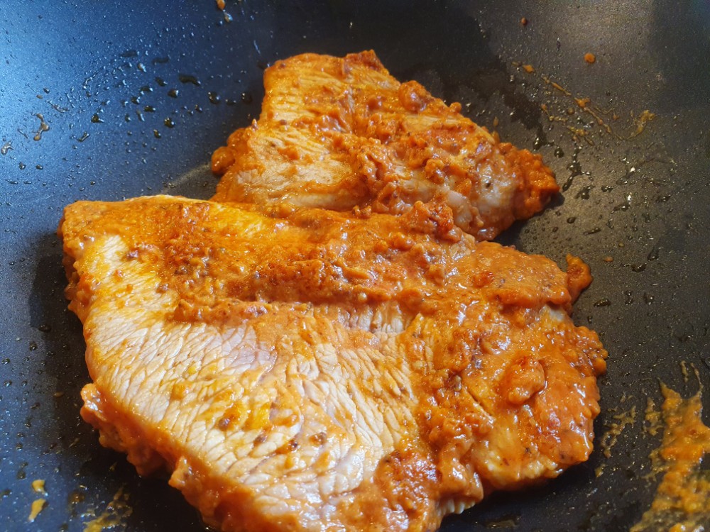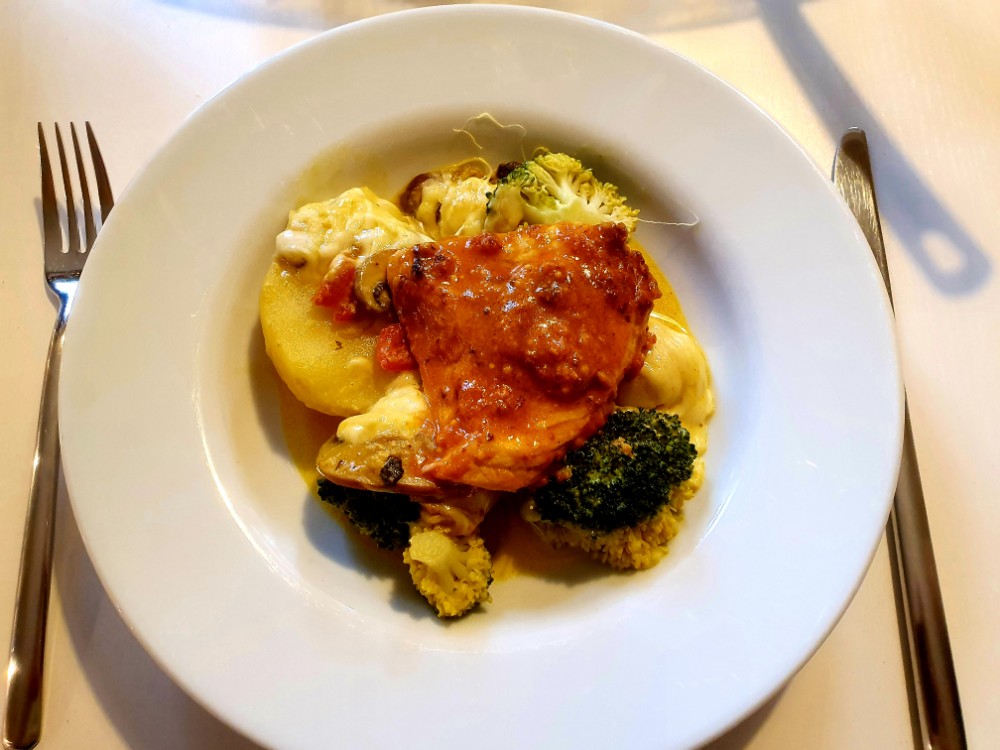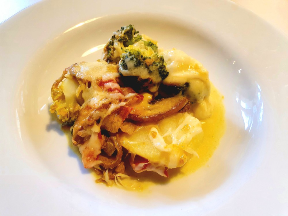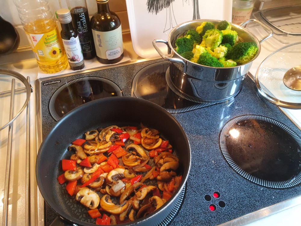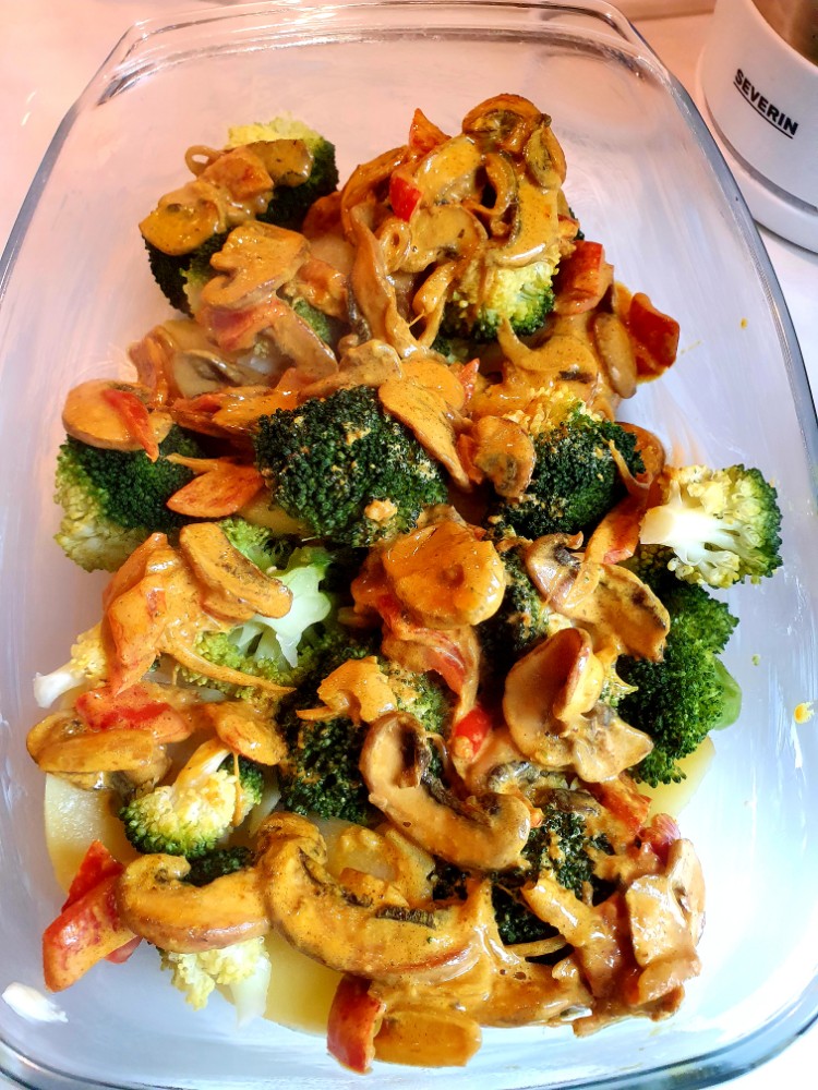Boa, was für eine herrliche Kombination: Die Basis für den Auflauf sind Kartoffeln und Brokkoli. Darüber habe ich in Knoblauchöl angebratene Champions mit Zwiebeln und Spitzpaprika gegeben. Diese wurden vorher in einer Pfanne mit Kreuzkümmel, Korkuma und Curry gewürzt und mit Sahne abgelöscht. Das Putensteak gabs extra, damit auch die Vegetarier was davon haben. Ich habe es in einer improvisierten Marinade aus Biersenf, Knobiöl, Tomatenmark und Chilisoße geschwenkt und dann im Wok angebraten. Mit Emmentaler überbacken hat es allen richtig gut geschmeckt! Lecker.