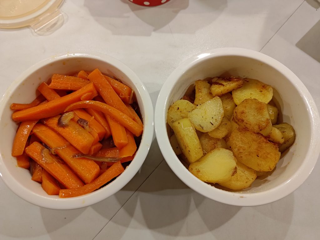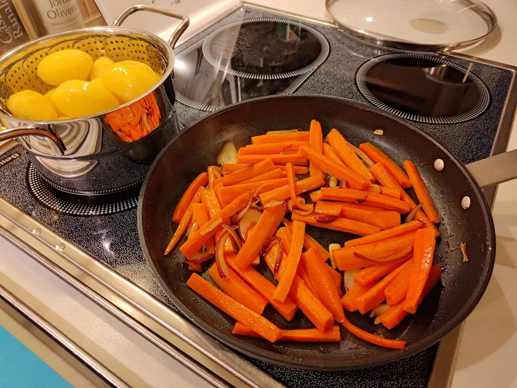 Alles muss raus! Nein, Schlussverkauf ist gerade nicht, ich wollte nur mal die Reste von Möhren und Kartoffeln wegbekommen. Also hab ich ein wenig experimentiert. Zuerst wurden die Möhren in etwas Butter angeröstet, wobei ich eine Prise Zucker darüber gestreut habe. Mit den Zwiebeln gibt das einen angenehm milden Geschmack (zwischendurch Kosten ist Pflicht). Nach ca. 10 Minuten habe ich etwas Wasser angegossen und den Deckel aufgesetzt. Nach weiteren 10 Minuten Schmoren/Dämpfen waren die Karotten aber sowas von lecker, ich hab gleich paar einfach so wegschnabbuliert. Nebenbei garten die Kartoffeln, aber auch nicht komplett durch, so dass ich in der gleichen Pfanne einfach ein paar Bratkartoffeln daraus machen konnte. Morgen kommt das auf dem Tisch, vielleicht mit einer Bratwurst. Mal sehen. Oder eben einfach so für die Vegetarier. Etwas Honig-Senf-Soße ist noch da. Schmeckt bestimmt hammermäßig. 😋