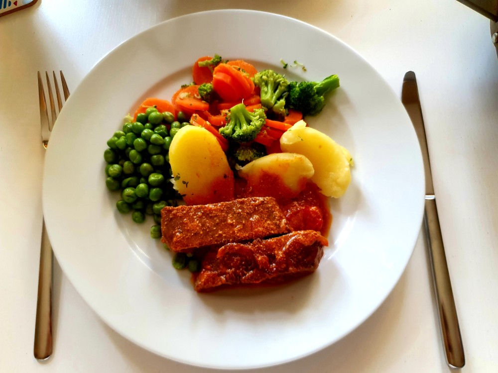 Gebraten in der Pfanne und dann mit Tomatenmark, Zwiebeln und Milch eine herrliche Soße gezaubert. Dazu gab es leckeres Allerlei-Gemüse und Kartoffeln.