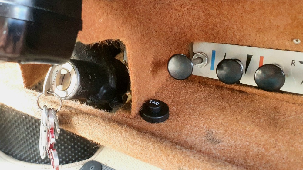 Da rappelt die Maschine wieder. Es war etwas anstrengend, jedesmal den Trabant anzuschieben. Nee Spaß, angeschoben habe ich ihn nicht. Aber das defekte Zündschloss hat mich doch ganz schön generft. Der Anlassermotor startete nicht, denn offenbar hat es die Leiterbahn der letzten Schalterstellung weggebruzelt. Als gelernter DDR-Bürger installierte ich zuerst einen Mikrotaster, weil es der einzige Taster war, den ich noch in meinem Bestand hatte. Allerdings fließt dort doch ganz ordentlich Strom über die Kontakte, so dass man sich ausrechnen kann, wie oft das gut geht. Kurzerhand bestellte ich einen Start-Taster, der die vielen Ampere verkraftet und baute ihn parallel zur Schalterstellung II des Zündschlosses ein.
