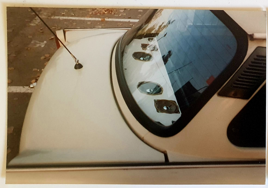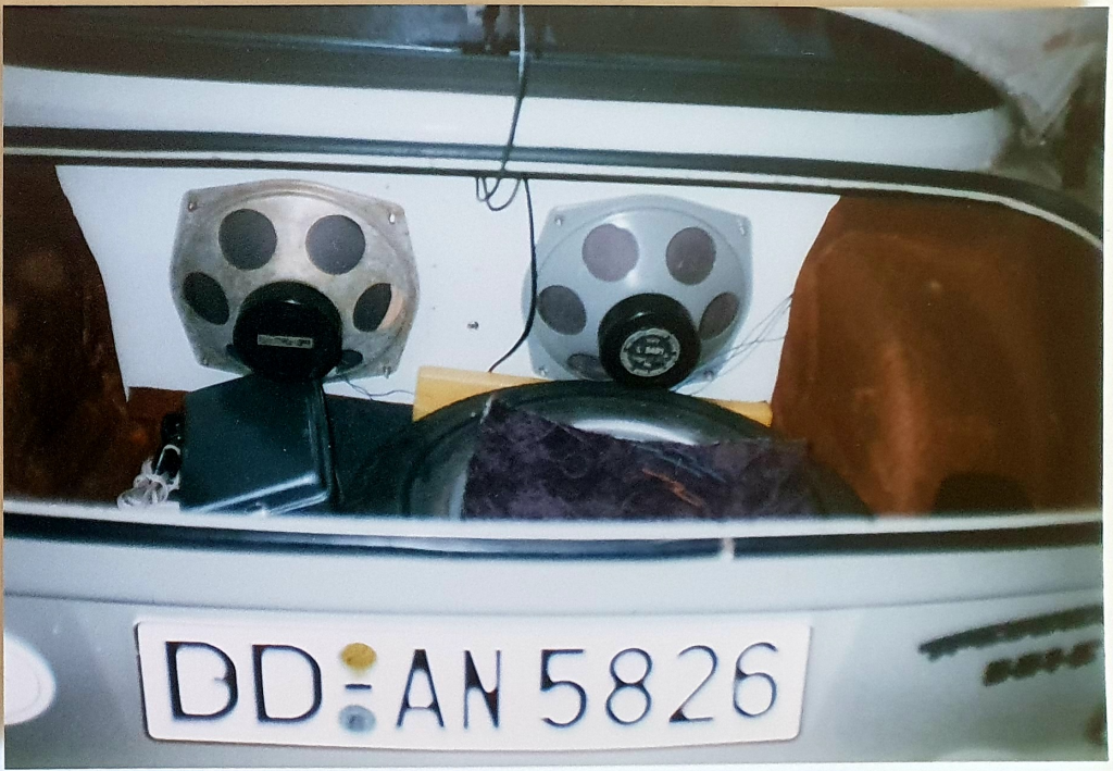 Eine fette Beschallungsanlage gehörte natürlich auch zum jugendlichen Wahnsinn. Am Kassettenradio war ein 10-Band-Equalizer angeschlossen und im Kofferraum waren insgesamt 4 Lautsprecher pro Kanal verbaut. Dabei wurden natürlich die beiden großen Tieftöner mittels Frequenzweiche zum Basslautsprecher gemacht und wummerten die Bässe über das Brett hinter der Rücksitzbank direkt in den Rücken der hinten sitzenden Passagiere. Aber auch vorn hatte ich meinen Spaß, denn der Trabant hat einen hervorragenden Klangkörper und schluckt nicht alles weg durch irgendwelche Polster oder ähnliches. Unter dem Amaturenbrett waren Frontlautsprecher verbaut und unter den beiden Vordersitzen saßen sogenannte „Bodyshaker“. Diese Dinger konnten Bässe als Vibrationen direkt auf die Karosse übertragen. Ein Himmelreich für mich als Technofreak.