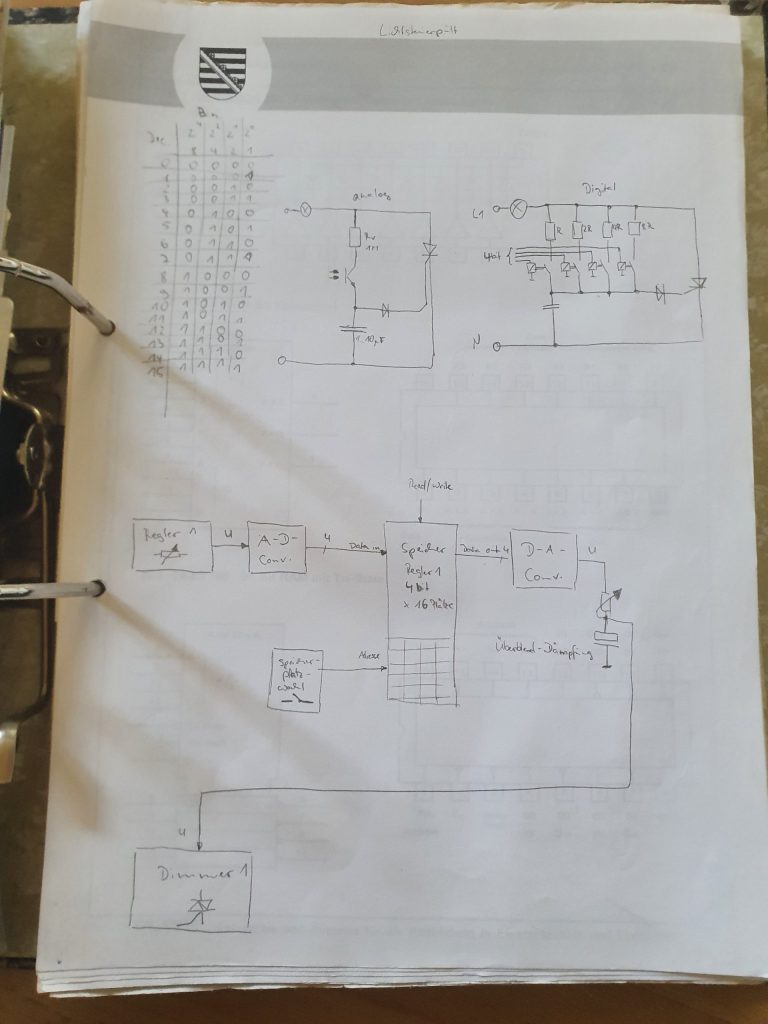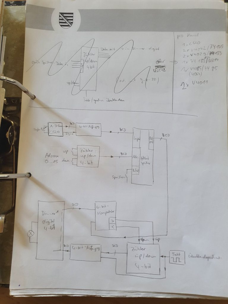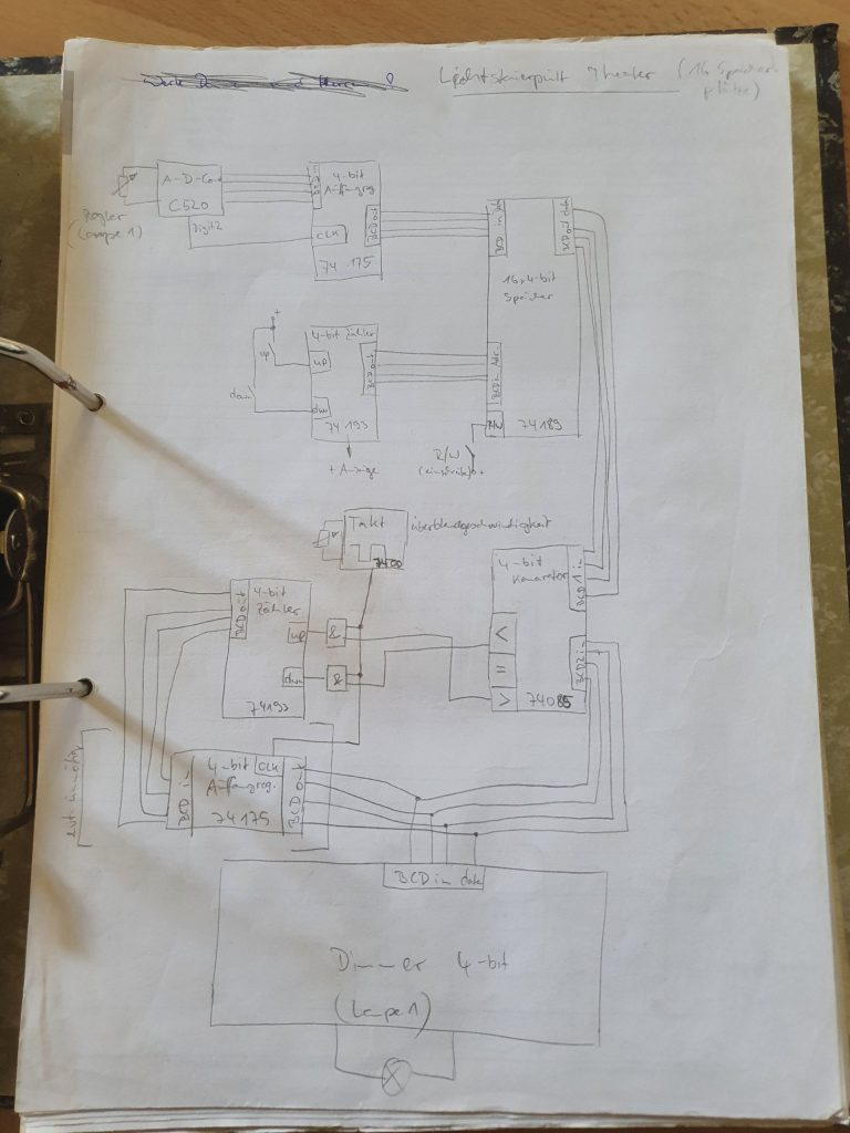 Damit es einer Disco ähnlich war, habe ich in meiner Bude noch eine Lichtanlage installiert. Gesteuert wurde alles über ein selbstgebautes Lichtsteuerpult, welches ich später sogar für das Schülertheater im Einsatz hatte. Lauflicht, Aussteuerungsanzeige und Stoboskop waren der heiße Scheiß der damaligen Zeit.