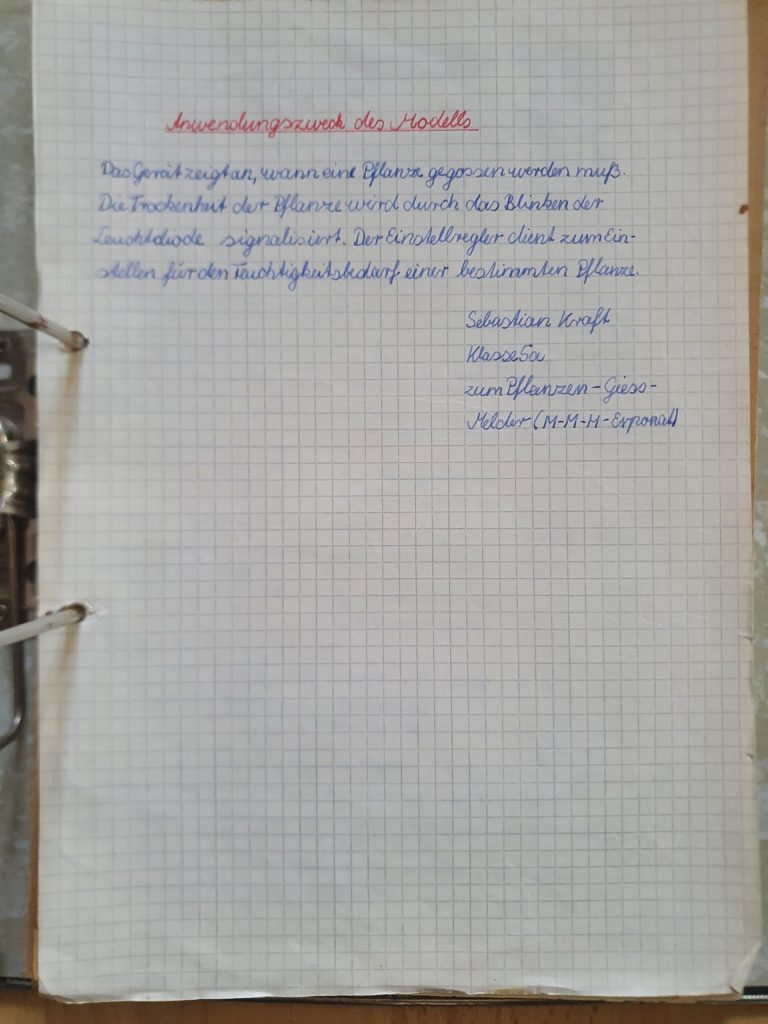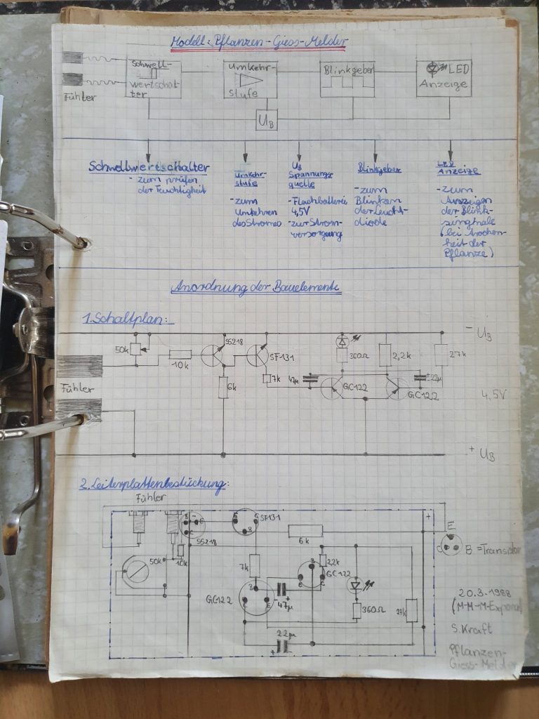 Seit meiner Kindheit bin ich der Elektronik verfallen. Mein Papa hat entscheidend dazu beigetragen, dass ich bereits mit ca. 10 Jahren mein erstes Elektronik-Projekt umsetzen konnte. Entstanden ist der „Planzen-Gieß-Melder“, welcher sogar erfolgreich bei der „Messe der Meister von Morgen“ als Exponat eingereicht wurde. Soweit ich mich erinnere, gabe es auch einen Preis dafür. Vorbildlich dokumentiert wurde die Wirkungsweise, das Schaltbild und der Aufbau des Gerätes in Form eines kleinen handschriftlichen Berichts.