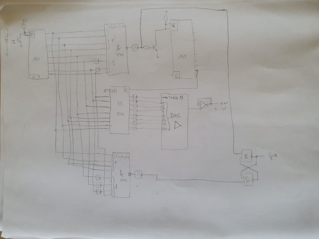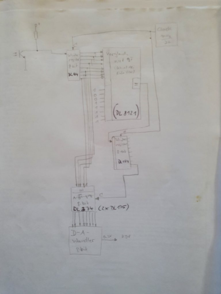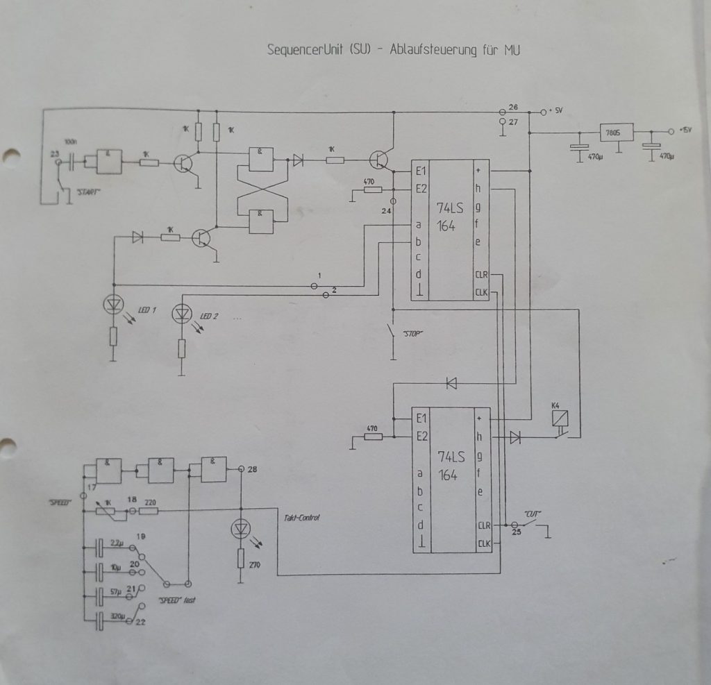 Diese erste Version der Silberkiste hatte noch keine digitale Kommunikation mit der Außenwelt an Board. Um Melodien zu programmieren brauchte es eine Möglichkeit, die eingespielten Töne bzw. die gedrückten Tasten zu speichern und sequenziell wieder abzurufen. Ich experimentierte mit TTL-Speicherschaltungen. Ein wirklicher Sequencer ist daraus leider nie geworden, ich hatte wohl die Anzahl der nötigen Baugruppen unterschätzt.