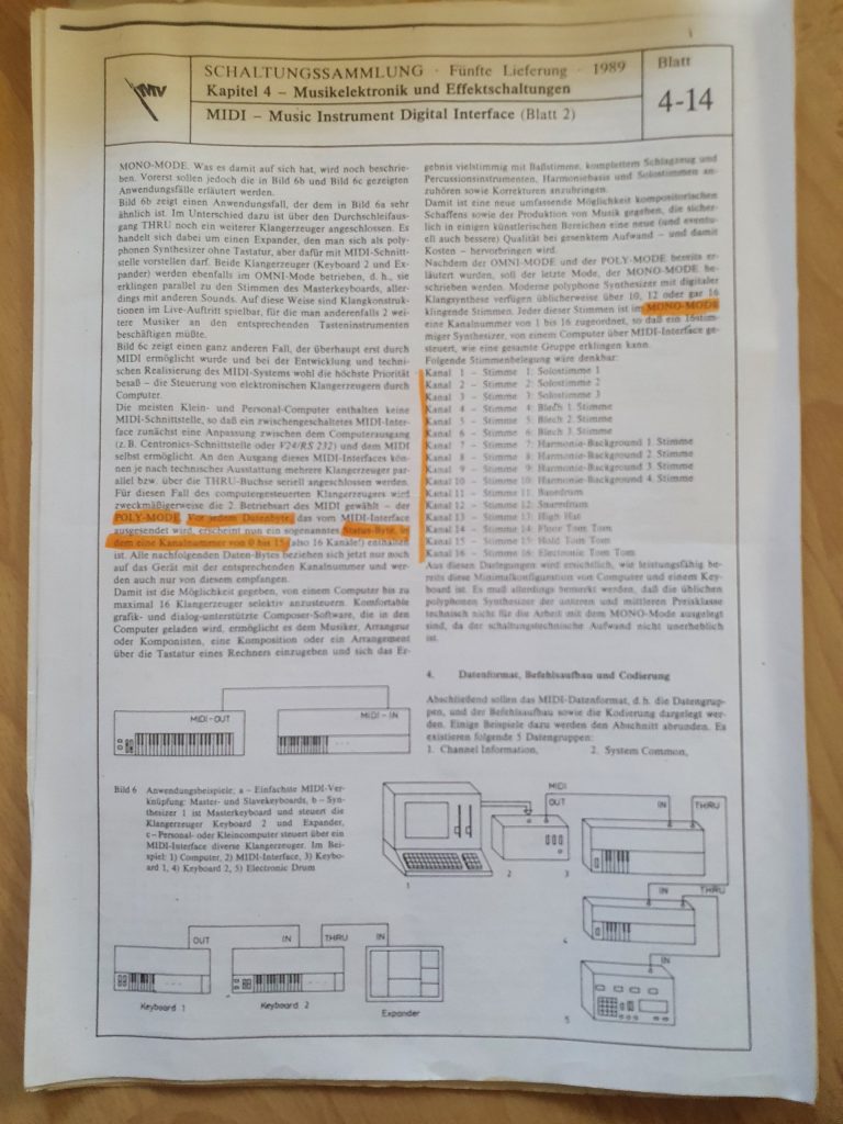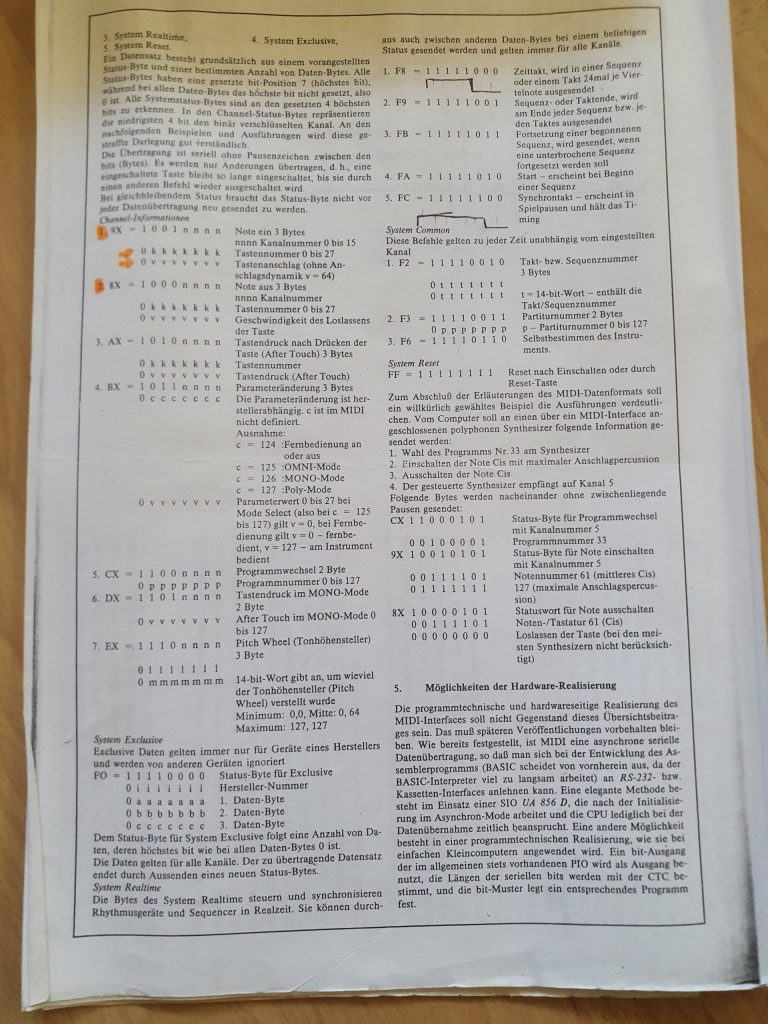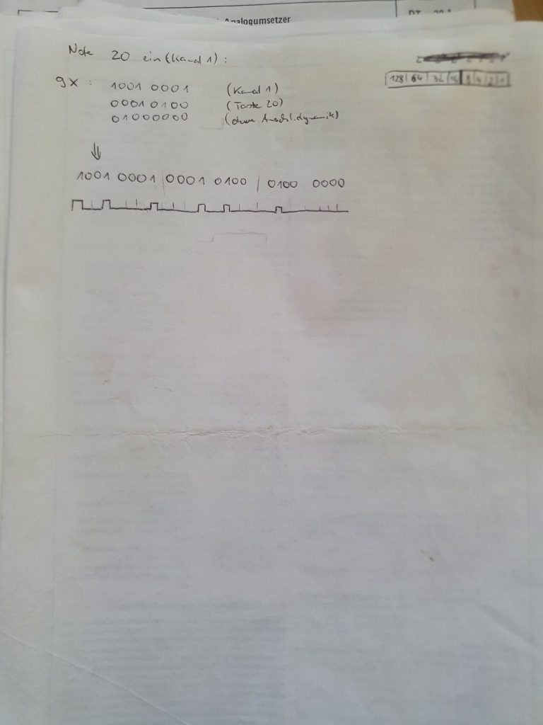 Als zunehmend die Computer zur Musikerzeugung genutzt wurden, begann ich mich mehr mit dem Thema MIDI auseinanderzusetzen. Die Theorie war recht einfach zu begreifen, an der Umsetzung für ein MIDI-Interface für den oben genannten Synthesizer scheiterte es leider abermals. Mit meinem Wissen und Können auf dem Gebiet der Elektronik und mit den mir zur Verfügung stehenden Mitteln konnte ich die analoge und die digitale Welt nicht miteinander verheiraten.