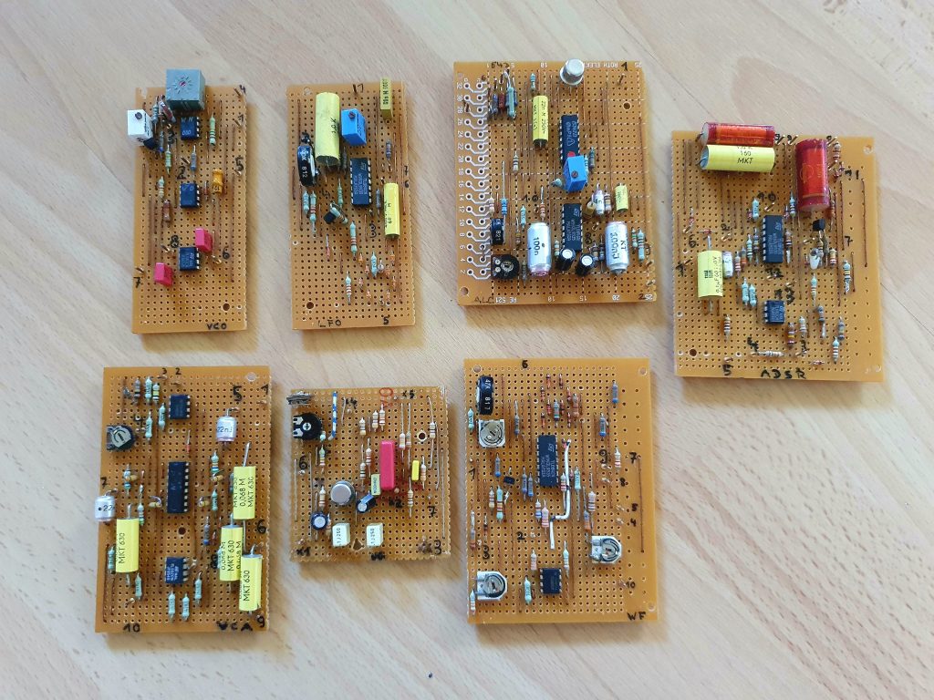 Elektronische Musik war in den 90er Jahren das große Thema bei mir. Auch ich wollte elektronische Musik machen. Und was braucht man dafür – na klar, einen Synthesizer. Abgeguckt vom Konzept der selbstgebauten elektronischen Orgel meines Papas fiel mir eines Tages das „Modulare Sythesizerkonzept“ aus der Schaltungssammlung zu Musikelektronik und Effektschaltungen in die Hände. Die Bauteile wurden sorgsam zusammengesucht, manchmal dauerte die Bestellung beim ansässigen Elektronikhändler auch etwas länger. Schließlich konnte ich mehrere Leiterplatten aufbauen, die in der Zusammenschaltung tatsächlich ein elektronisches Musikinstrument ergaben.