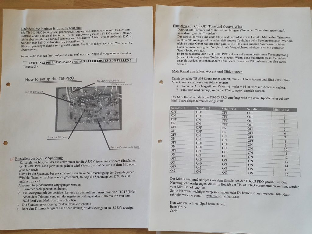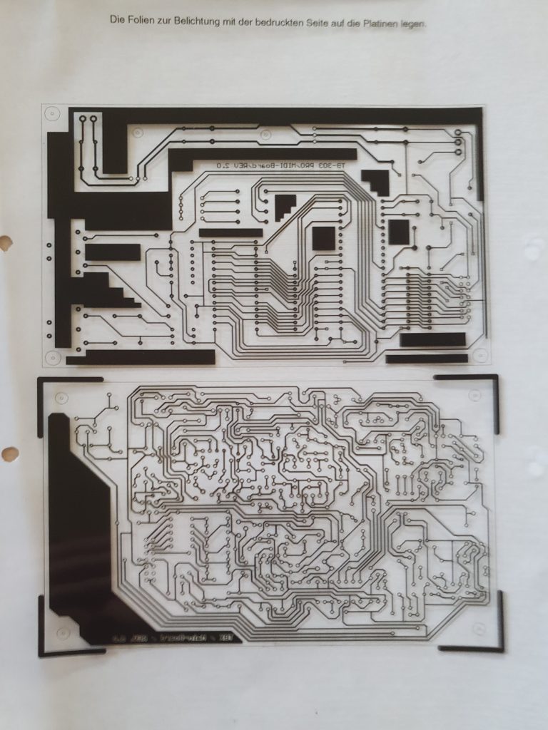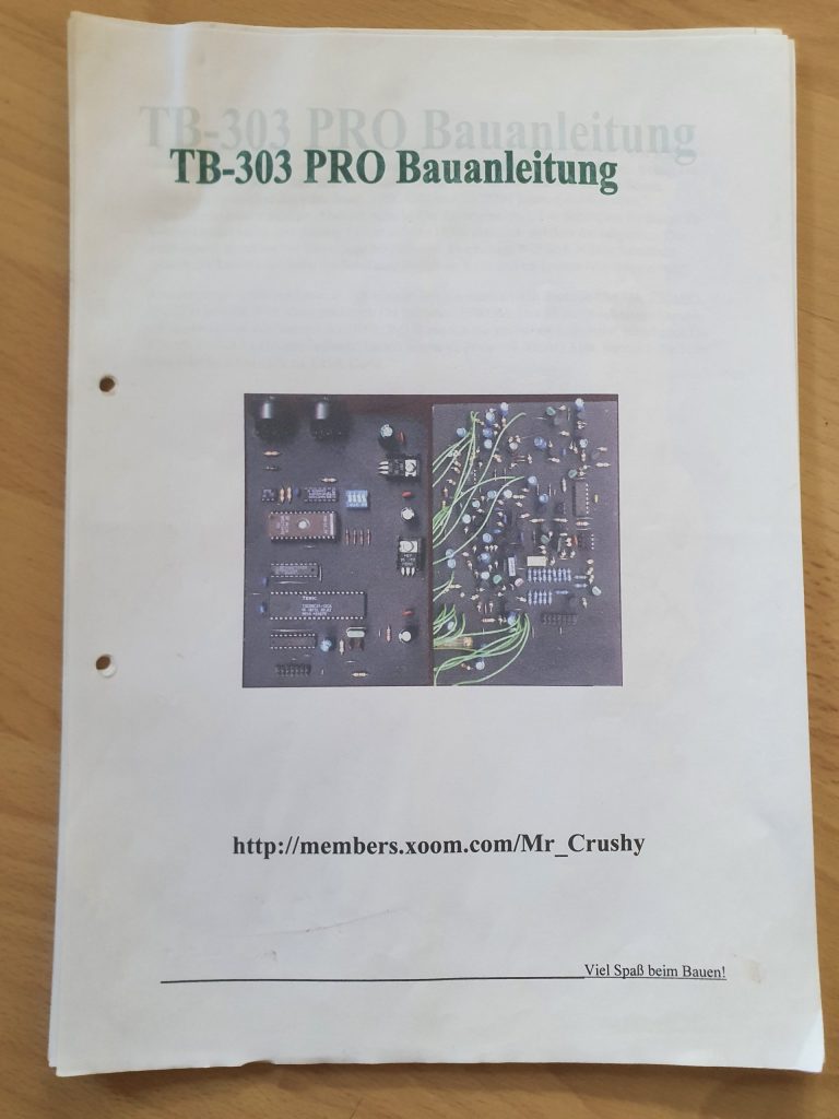 Ende der 90er Jahre stieß ich auf eine Bauanleitung für einen MIDI-gesteuerten Synthesizer, welcher den Klang einer Roland TB-303 nachahmte. Über das Internet bestellte ich bei Mr. Crushy und lies mir die Dokumente per Post schicken. Ich bin mir nicht mehr ganz sicher, ob ich die Leiterplatte mittels der mitgelieferten Vorlage fürs Ätzen hergestellt habe oder ob ich ein eigenes Layout angewendet habe. Jedenfalls ist, wie bei meinen anderen Projekten, durch Erstellung einer Aufbauzeichnung die zweite Version der Silberkiste „TB303PRO“ entstanden.