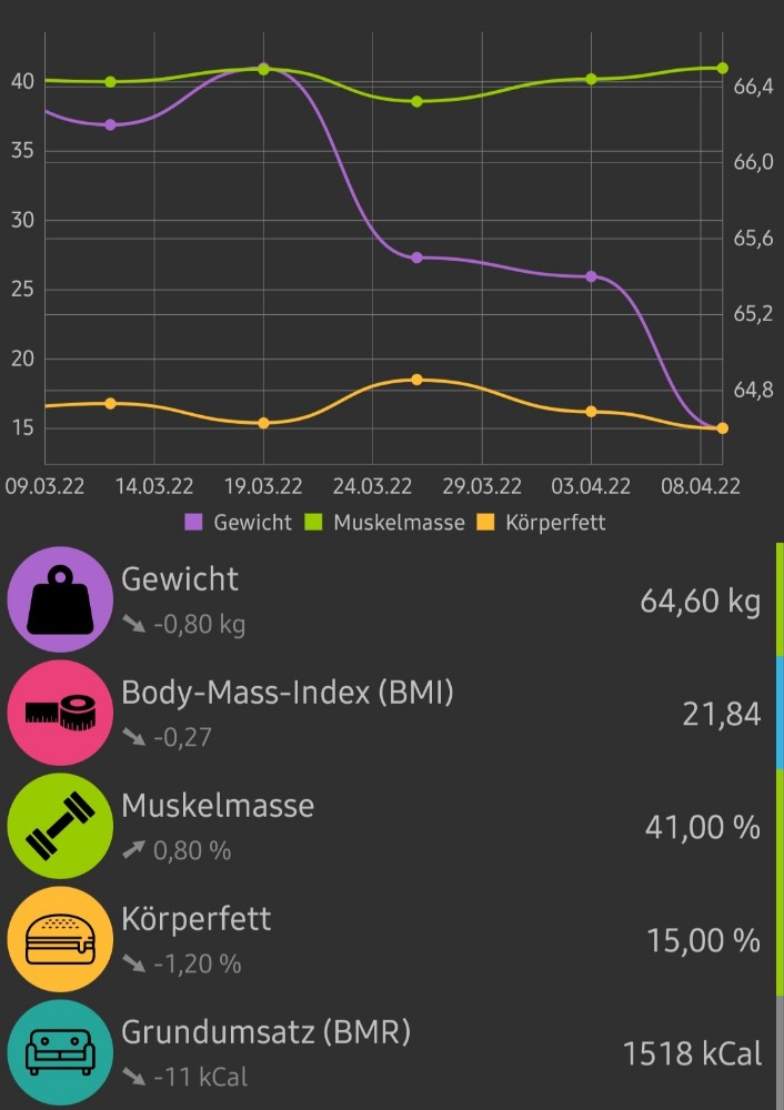 Welch schöner Anblick der Zahlen auf dem Display der Waage. Diese Woche konnte ich mein Ziel von „Gewicht: 65kg, Körperfett: 15%, Muskelmasse: 40%“ erreichen. Ich bin schon ein bisschen stolz auf mich. Wahrscheinlich hat mir auch die Corona-Erkrankung etwas geholfen, denn zu Hause isst man anders als auswärts. Vermisst habe ich aber arg den Sport. Ich musste mich sehr zurücknehmen und einige Einheiten absagen. Doch nächste Woche darf und kann ich wieder langsam beginnen. Und somit heißt mein neues Ziel: „Werte halten, Körper formen“. 💪