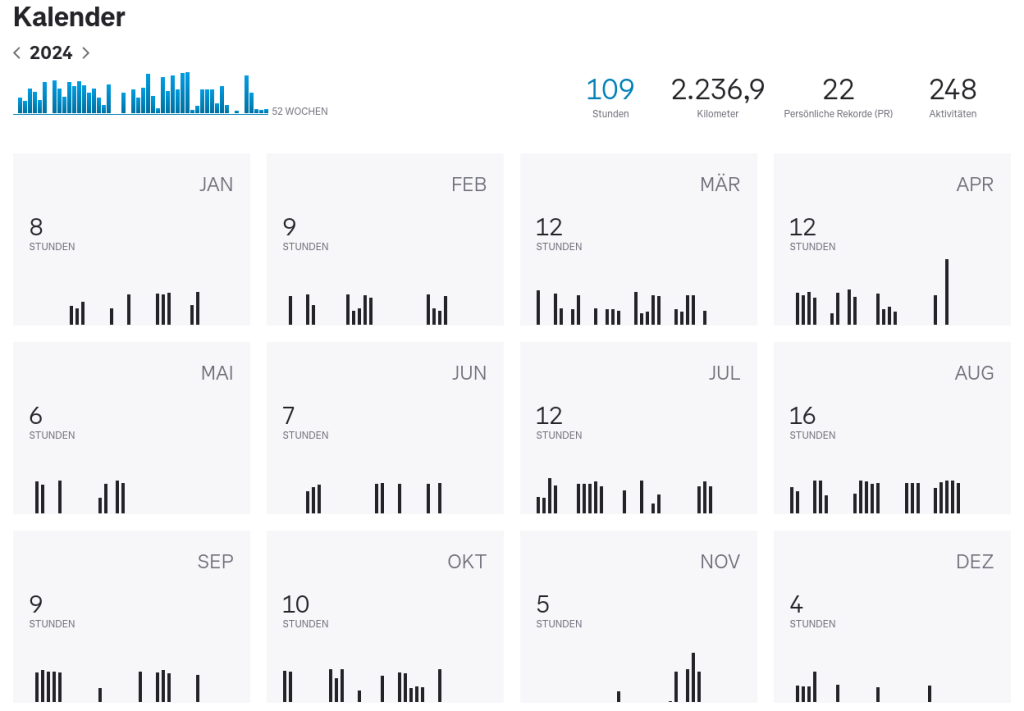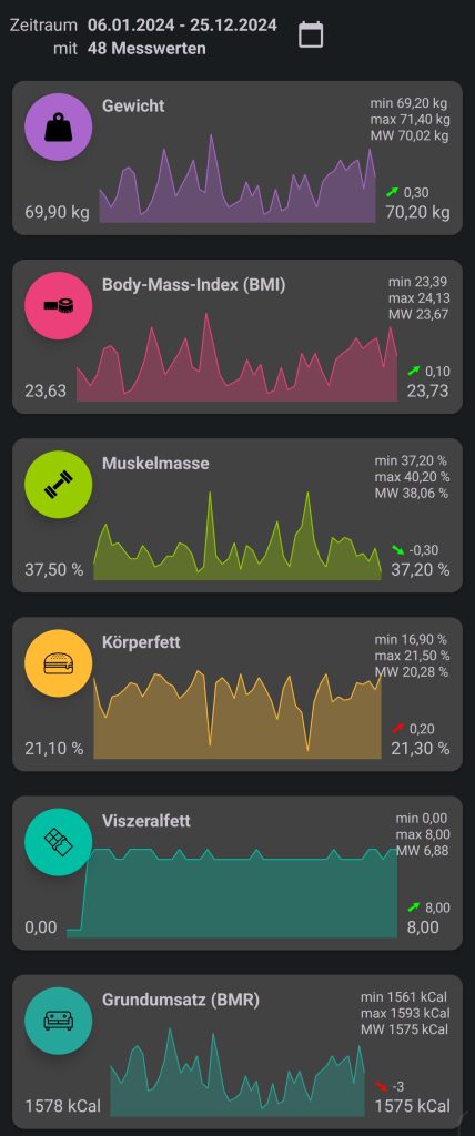 Wenn ich so darüber nachdenke, war 2024 doch ein recht sportliches Jahr für mich! Ich kann auf mehr als 2000 gefahrene Rad-Kilometer, 60 absolvierte EMS-Trainingseinheiten und „grandiose“ 7 gelaufene Jogging-Kilometer zurückblicken und stolz darauf sein. Dabei konnte ich mein Gewicht von 70kg halten, wobei es im Laufe des Jahres immer mal wieder bergauf und bergab ging. Das ist ja aber ganz normal. Mein Ziel, die 65kg wieder zu erreichen, wird dann vielleicht im nächsten Jahr gelingen? Auch die anderen Werte sind wie erwartet relativ stabil geblieben, die durchschnittliche Muskelmasse liegt bei ca. 38% und der durchschnittliche Körperfettanteil liegt ca. 20%. Auch dafür wünsche ich mir wieder Werte um 40% Muskelmasse und vielleicht Richtung 15% Körperfett? Ich habe gemerkt, dass ich vermutlich auch durch mein Alter solche Ergebnisse nur durch ausgeglichenen Sport und gute Ernährung erreichen bzw. halten kann. Auch das erkläre ich zum Ziel für das kommende Jahr: sportlich aktiv bleiben und vielleicht noch etwas mehr auf die passende Ernährung achten.