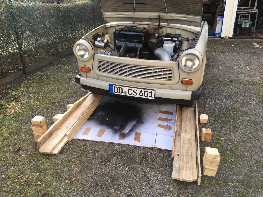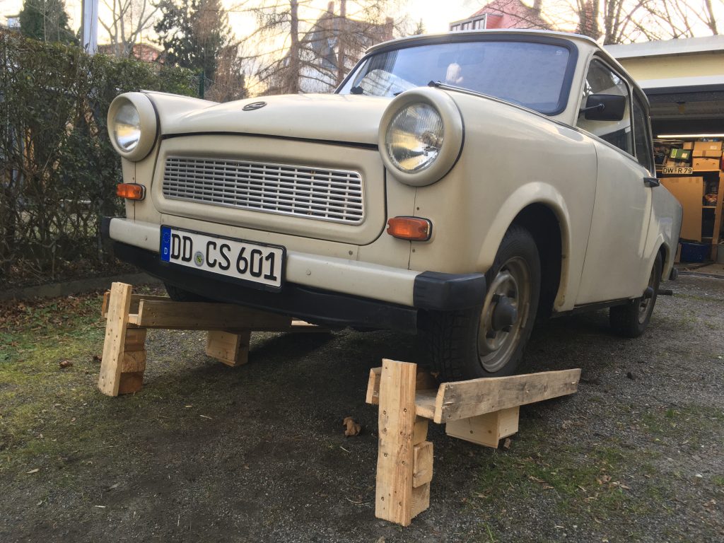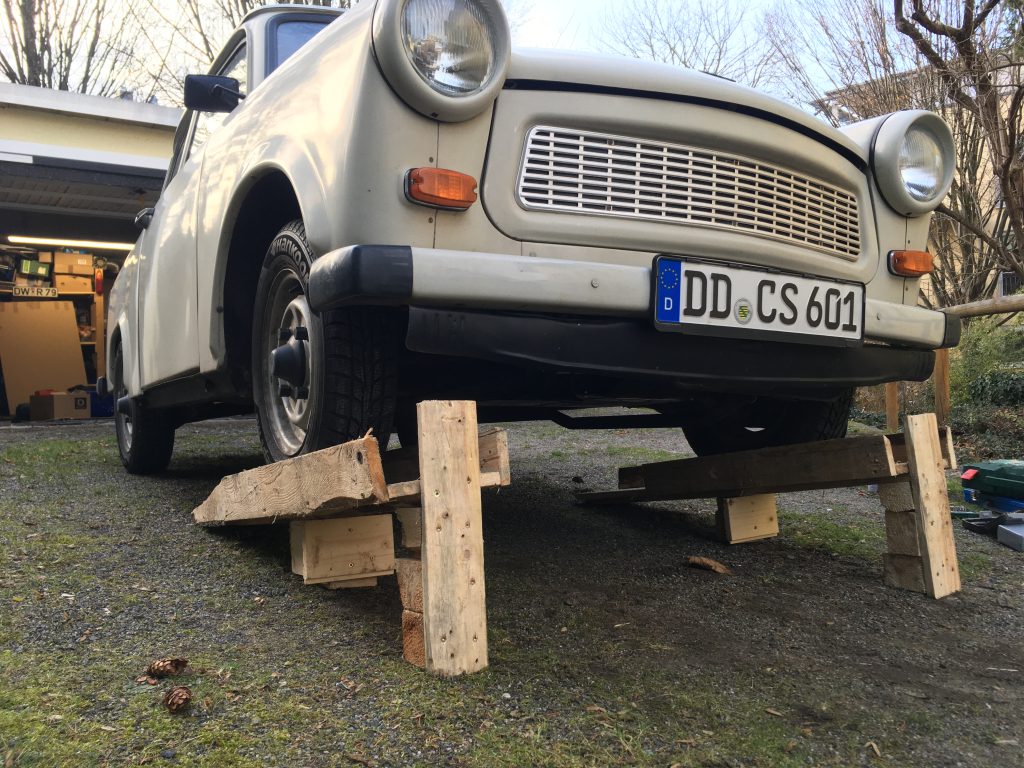 Manchmal muss auch unter dem Trabant gearbeitet werden. Dafür habe ich mir beim Pappen Frank (Youtube) die Konstruktion einer Rampe abgeguckt. Aus einer alten Euro-Palette habe ich mir zwei Rampen gebaut, die gar nicht so schlecht funktionieren. Die Teile haben noch Verbesserungspotential, aber für eine erste Version funktioniert es ausreichend gut. Ich habe mich zwar nicht getraut, bis ganz hoch zu fahren, da die Stabilität noch etwas mau ist, aber bis zur Hälfte hat es schon gehalten. Mal sehen, wie ich das Ganze noch etwas stabilisieren kann und wo ich es in der Garage gut verstauen kann. Wird schon…