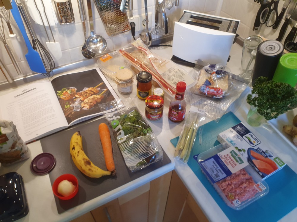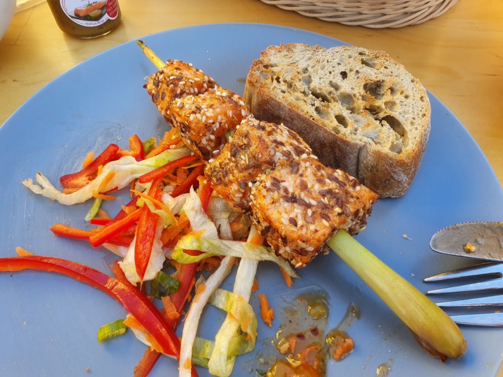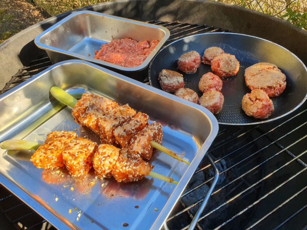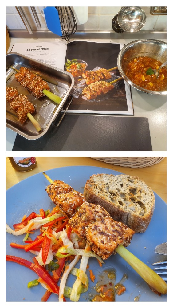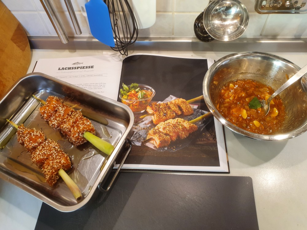 Lachsspieße leicht asiatisch angehaucht habe ich heute mal probiert. Und da nicht alle Familienmitglieder Fisch mit Sesam und Leinsamen mögen, gab es noch eine Variante mit Hackfleisch. Das Ganze wurde auf italienischem Kräuterbrot mit einer Mango-Minz-Vinaigrette und einem leichten Salat mit Weißem Käse serviert. Damit liegt die Latte der Grillspezialitäten zum Saisonbeginn schon recht hoch. Schauen wir mal, was das Jahr noch so für Leckereien zu bieten hat.