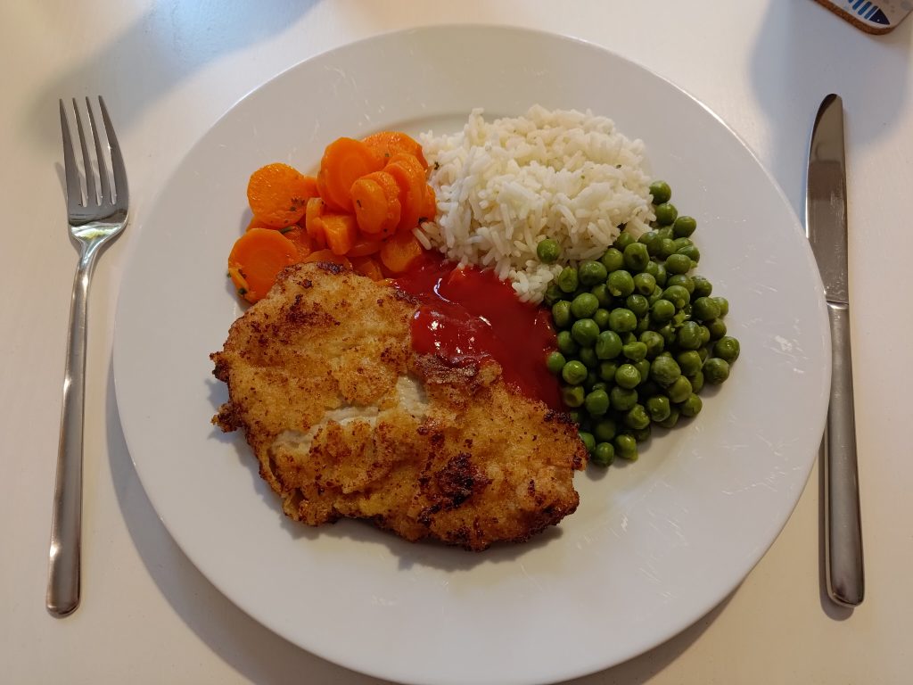 Es ist klassisch und passt eigentlich fast immer. Das Schnitzel gab es heute mal mit Reis, das muss aber nicht jedes Mal sein – finde ich. Geschmeckt hat es aber wunderbar. đŸ·âžĄïžđŸ„©