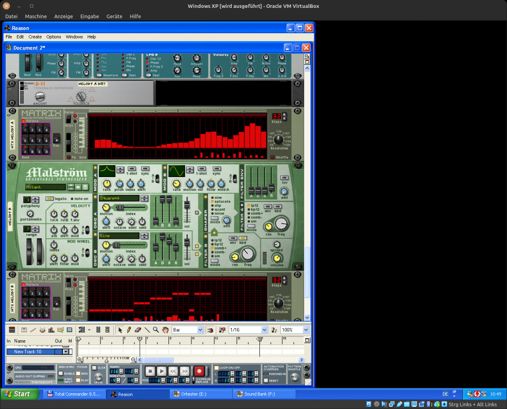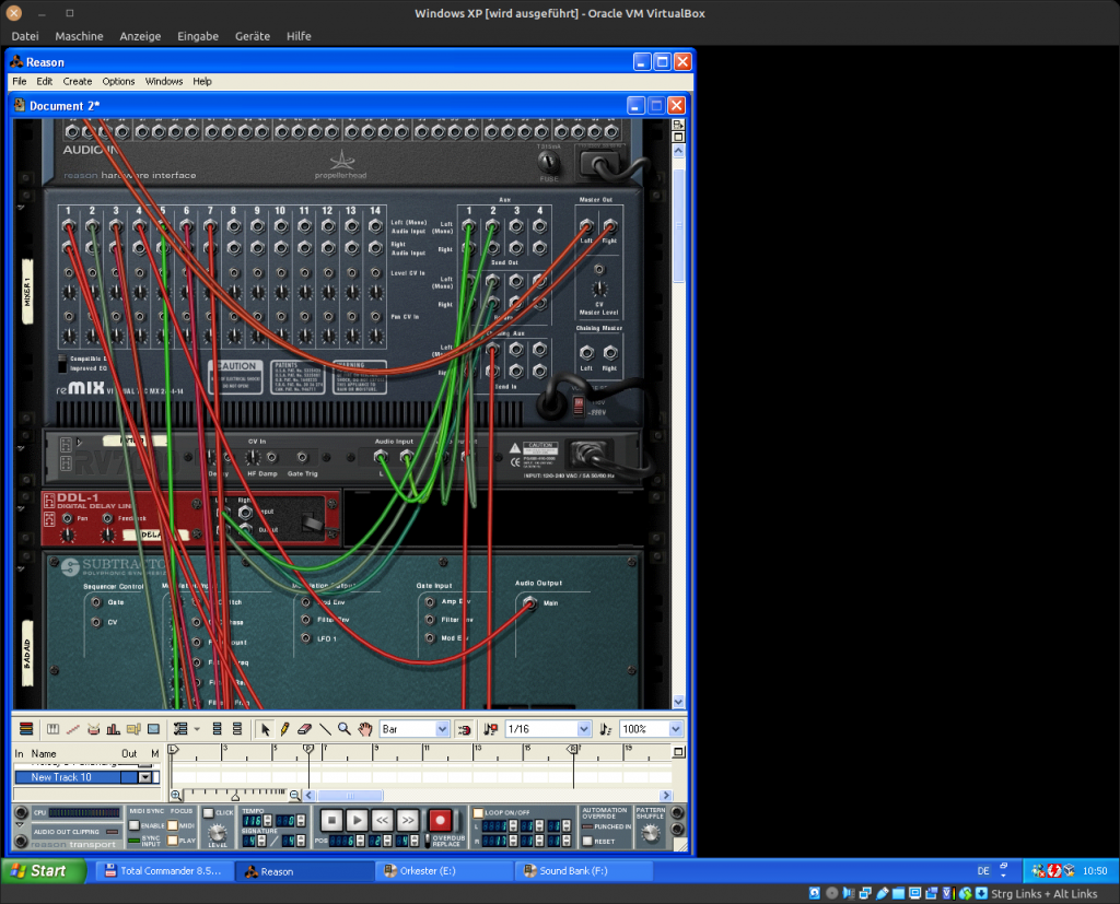 Ich erwähnte eben das ReWire-Tool von Cubase. Darüber war es möglich, andere Softwaresythesizer anzubinden und zwar nicht über MIDI, sondern über einen internen Layer. So kam es, dass ich mich schnell in die Software Propellorheads Reason verliebte. Es gab Synthesizer, Rhythmusmaschinen, Sampler, Mixer und viele viele viele weitere Maschinen, die man einfach in ein virtuelles Rack einbauen konnte. Nach dem virtuellen Verkabeln mittels TAB-Taste und Kabel zeihen mit der Maus – was ich bis heute als eines der coolsten Dinge überhaupt empfinde – hatte man dann diverse Software-Kanäle belegen können, die wiederum in Cubase über das ReWire-Tool zur Verfügung standen. Somit konnte man das Arrangement in Cubase machen, die Tonerzeugung erledigte Reason, die Aufnahme fand wieder in Cubase statt. Alles auf dem selben Rechner. Alle Daten waren vollständig synchronisiert. Es gab softwarebasierte Audiostreams, Controls und Timings – vergleichbar mit dem heutigen DANTE-Protokoll.