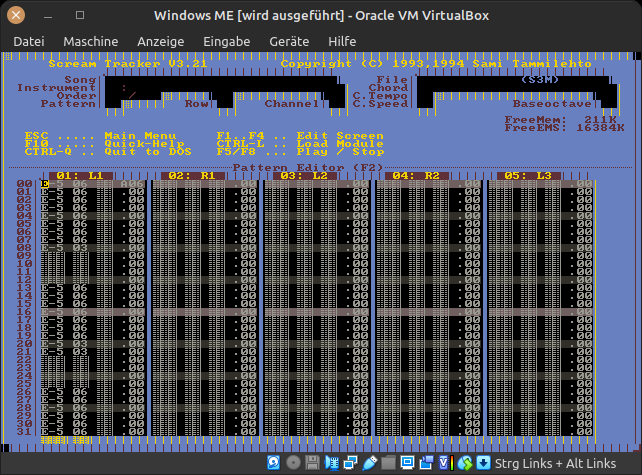 Die ersten Gehversuche auf dem Musikpfad unternahm ich mit dem Programm „Scream Tracker“. Das Programm brauchte nur eine DOS-Umgebung und einen Soundblaster, der die Klänge hörbar macht. Ein 386er PC mit MS-DOS 6.22 war vorhanden, die Soundkarte erkaufte ich mir Mitte der 90er Jahre. Damit ein Musikstück mit Hilfe dieser Software entstand, musste man Instrumente laden und ansteuern. Dies konnte entweder der FM-Synthesizer der Soundkarte sein oder man nutzte gesampelte Soundschnipsel, welche als WAV-Datei auf der Festplatte lagen. Der Scream Tracker ist ein Mehrspur-Sequencer ohne Schnittstelle nach außen. Ein dort erstelltes Werk konnte man nur Abspielen und über die (analoge) Audioschnittstelle mit einem anderen Gerät aufzeichnen. Das ist auch der Grund, warum in meinem Studio immer zwei Computer standen. Einer spielte das Lied ab, der andere nahm auf. So habe ich digitale Masterdateien meiner Werke erzeugt.