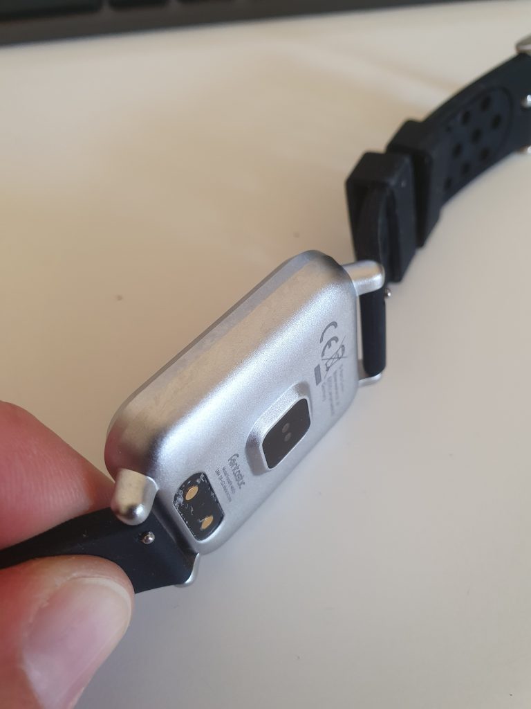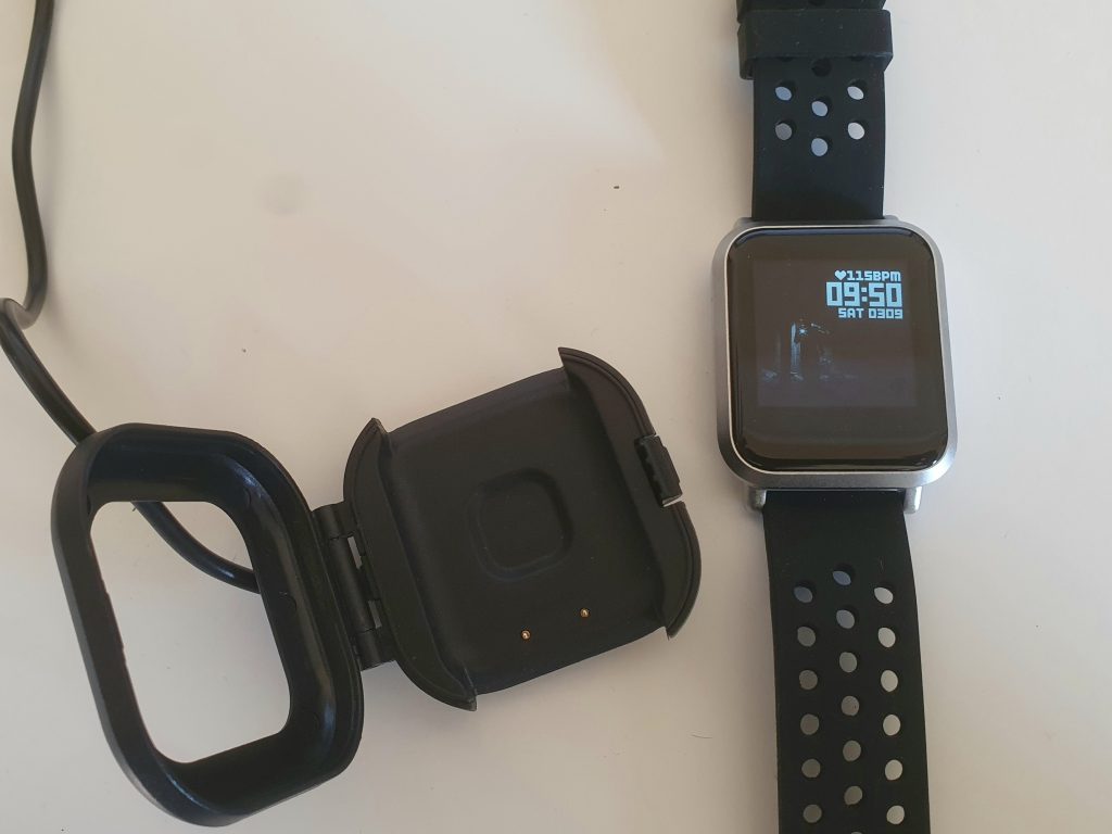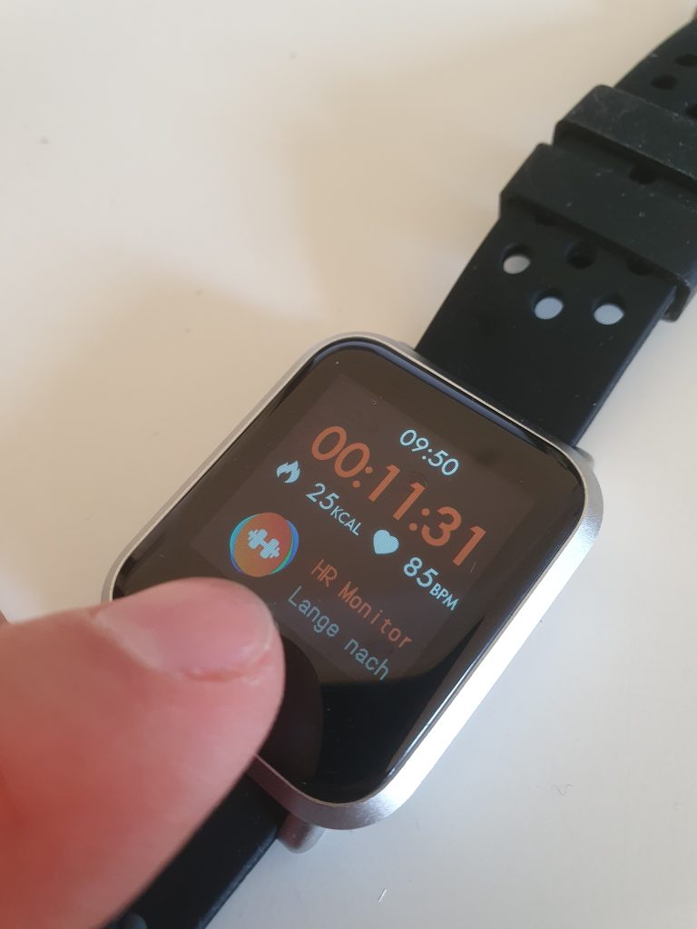 Am Abend der Lieferung lud ich das Gerät in der beigelegten Ladeschale. Die Art und Weise dieser Schale finde ich ganz clever, die Uhr wird in einem Rahmen eingeklemmt, so dass die Kontakte immer sitzen. Mal sehen, wie lange die Plastikkappe hält. Nach dem ersten Einschalten und Koppeln mit dem Smartphone entdeckte ich das Bedienkonzept der Uhr. Sie hat nur eine einzige berührungsempfindliche Taste unterhalb des Displays. Quasi ein Home-Button, wie man ihn vom iPhone kennt. Die Navigation durch die Menüs erfolgt durch kurzes oder langes Drücken des Buttons. Das finde ich schon irgendwie smart und nun erklärt sich auch, dass die Uhr wirklich als wasserdicht verkauft werden kann. Es sind keinerlei mechanische Teile verbaut. Somit kann das Gehäuse korrekt abgedichtet werden. Das Gehäuse ist übrigens aus Metall und das wechselbare Armband fühlt sich hochwertig an.
