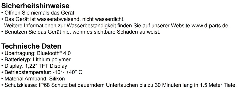 Ich möchte einen Auszug aus der Anleitung ergänzen, der sich auf die Eigenschaft „wasserdicht“ bezieht. Ich werde wohl sicherheitshalber nicht mit der Uhr ins Wasser gehen.