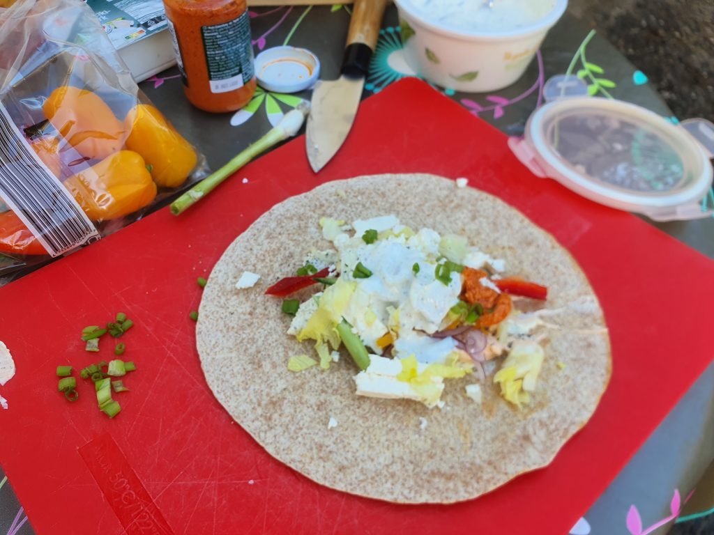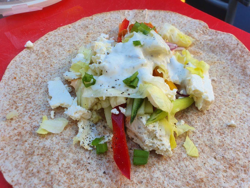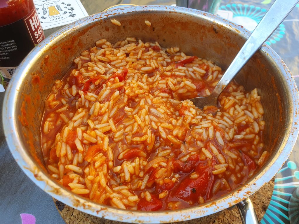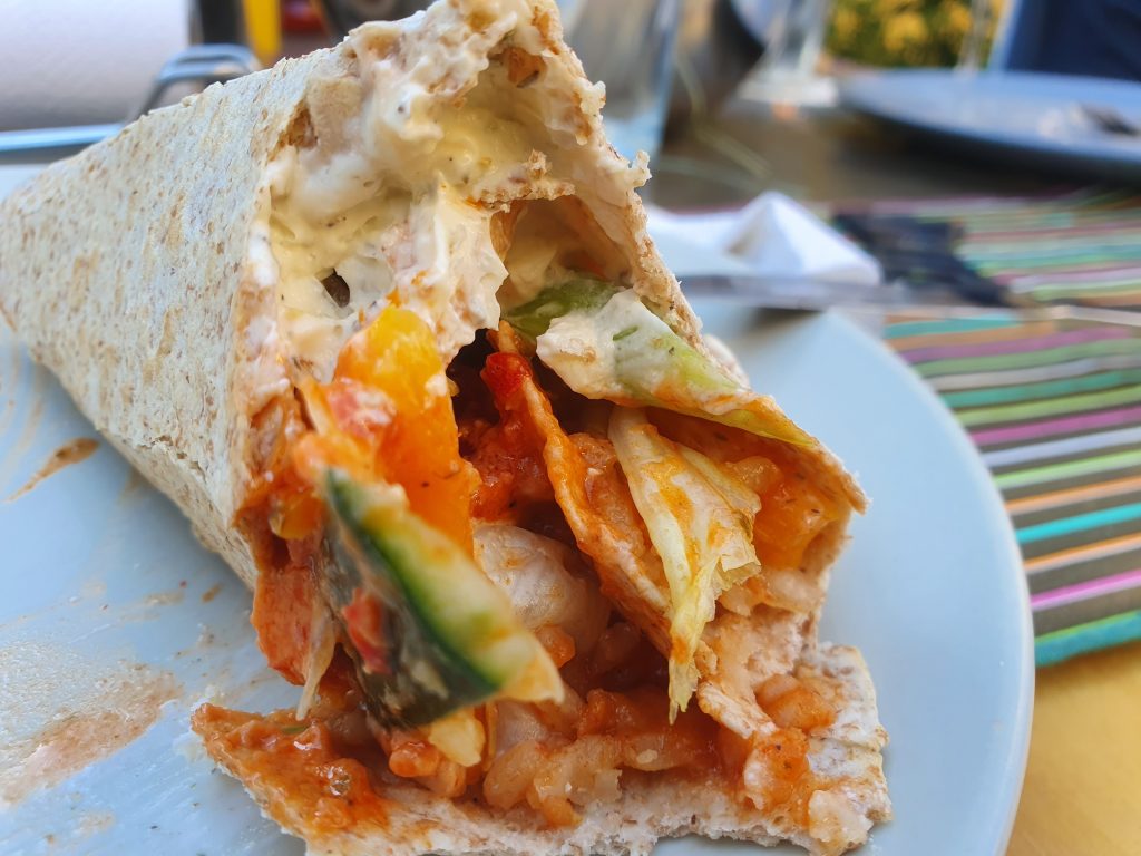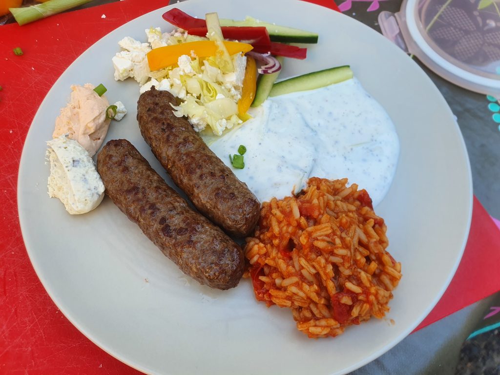 Die Sache mit dem Ćevapčići mit Tzatziki und dem Tomatenreis wollte ich unbedingt mal probieren. Dass mir das so gut gelungen ist, hätte ich nicht erwartet. Gut, okay, für den Tomatereis hatte ich noch eine griechische Würzmischung verwendet, aber erst mit den frischen Tomaten und dem leicht in Olivenöl angeröstetem Tomatenmark hat es dem Reis den passenden Geschmack gegeben. Dieses Gericht empfehle ich dringend zur Nachahmung. Für die Vegetarier gab es noch mal Wraps. Ich habe mir auch einen gerollt und kann nur sagen: LECKER!